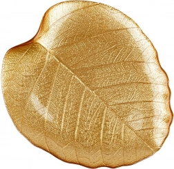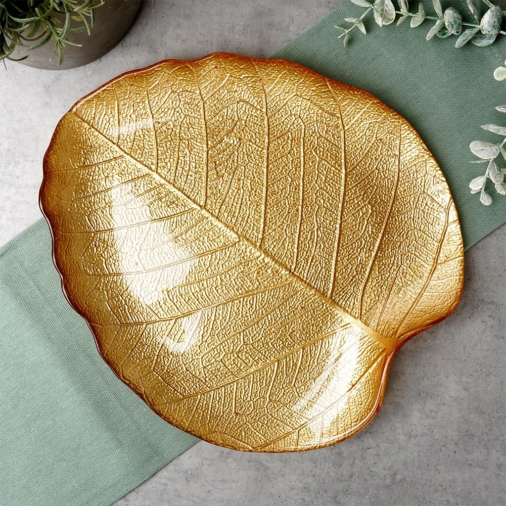 Vneste na stôl šmrnc prírody v prémiovom prevedení. Sklenený tanier v tvare listu vyniká zlatým leskom a detailnou textúrou žiliek, ktorá dodáva autentický, elegantný vzhľad. Perfektný na každodenné stolovanie aj slávnostné príležitosti.