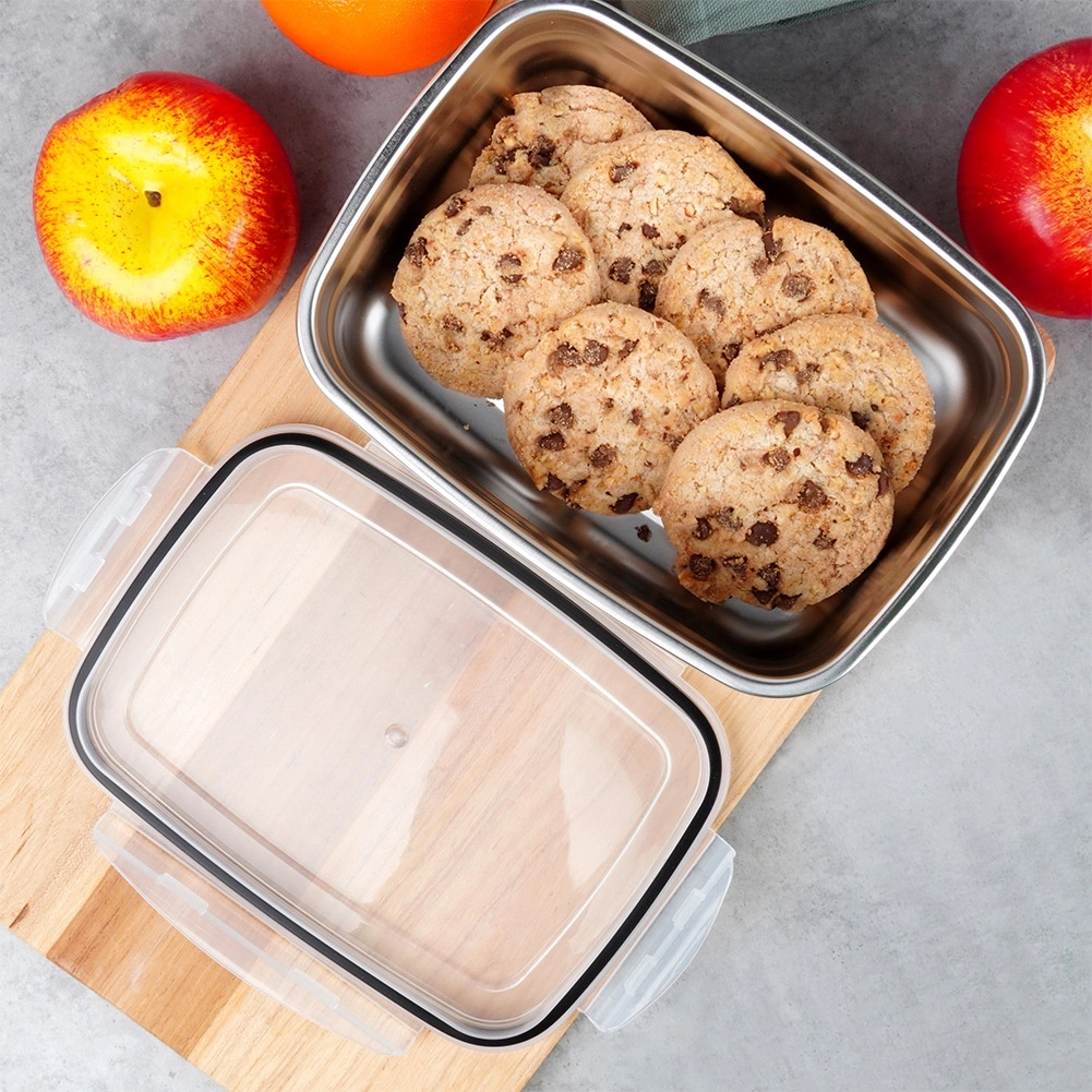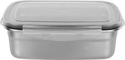 Spoľahlivá krabička na obed aj skladovanie potravín. Nerezové telo je ľahké, hygienické a odolné voči pachom, priehľadné viečko s tesnením a štyrmi klipsami zaistí bezpečné a tesné uzavretie bez vytekaniu. Ideálne do práce, školy, na výlety aj na domáce uchovávanie jedál.