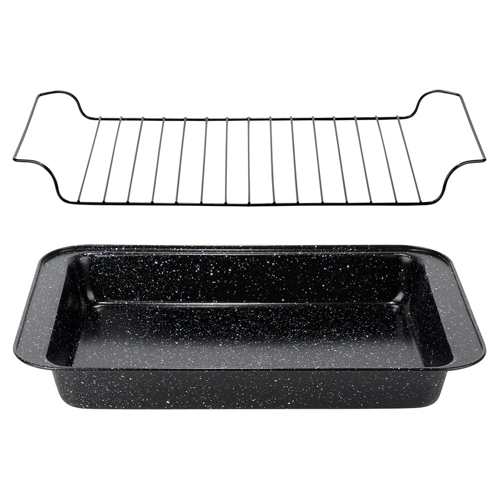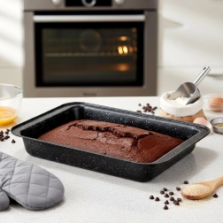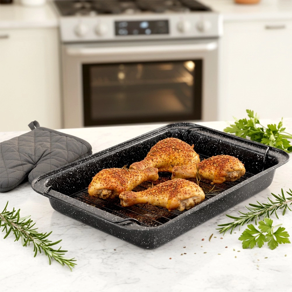 Tento robustný pekáč s rozmermi 37,5 × 25,5 × 5 cm je skvelou voľbou na každodenné varenie aj sviatočné pečenie. Nepriľnavá granitová povrchová úprava bráni pripaľovaniu aj pri minimálnom množstve tuku a umožňuje zdravšiu prípravu jedál. Vyberateľný kovový rošt udržiava mäso nad výpekom, takže sa pečie rovnomerne zo všetkých strán.