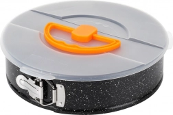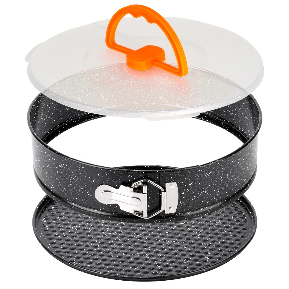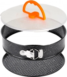 Praktická okrúhla tortová forma z odolnej ocele s granitovou povrchovou úpravou pre rovnomerné pečenie a ľahké vybratie korpusov. Rozpínací prstenec, vyberateľné dno a plastové veko s držadlom zaistia pohodlné pečenie, skladovanie aj prenášanie tort a cheesecakeov.