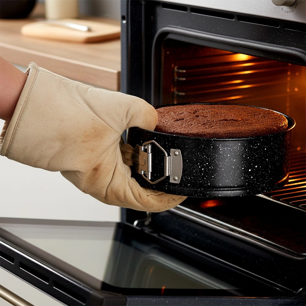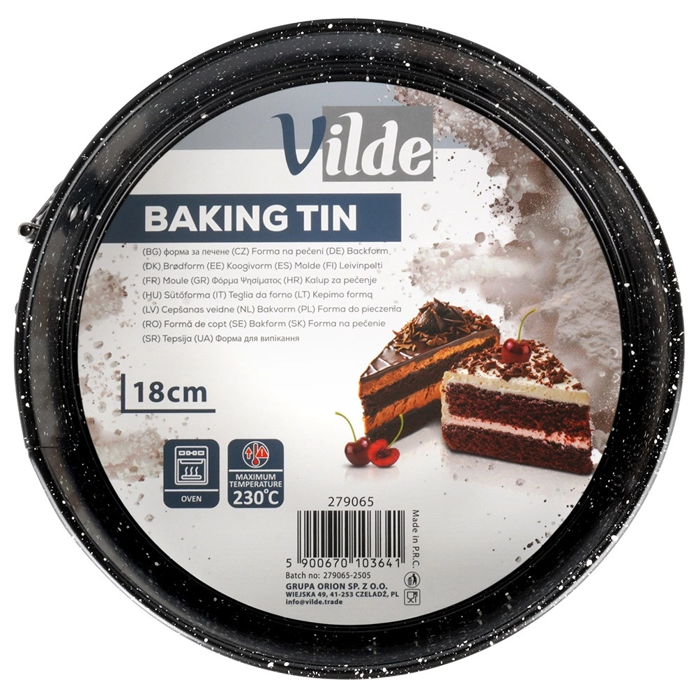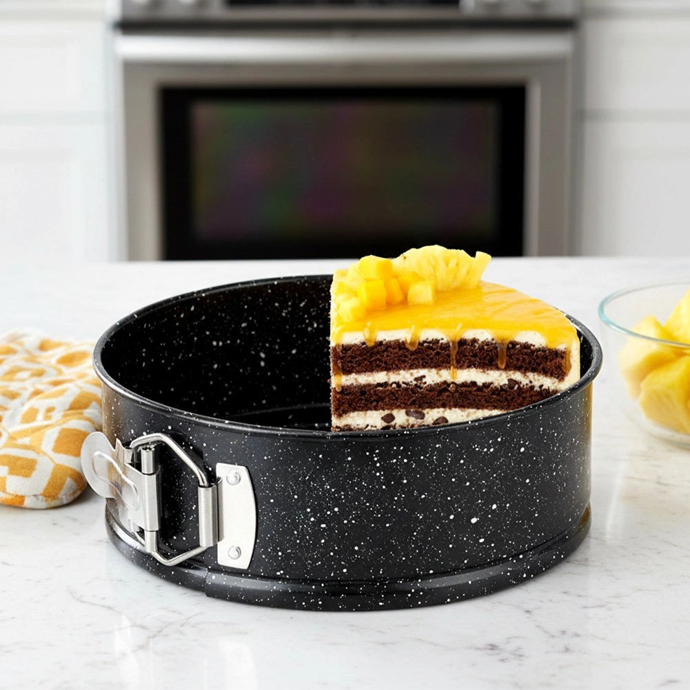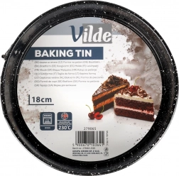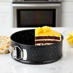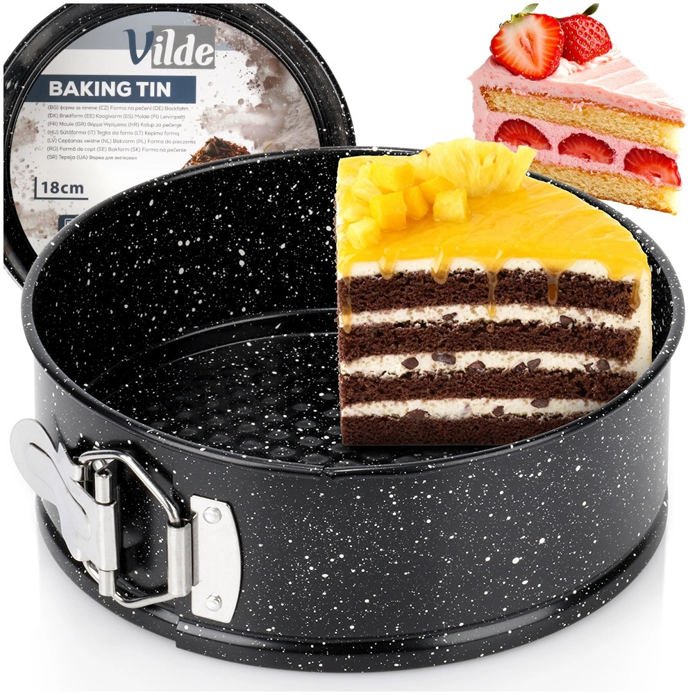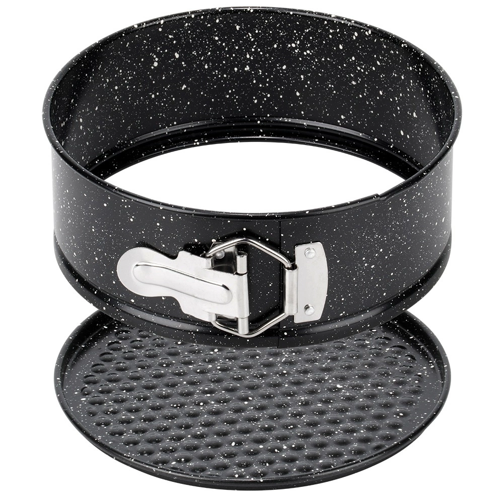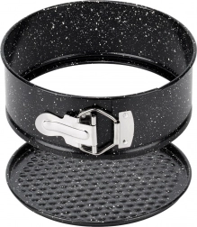 Praktická okrúhla tortová forma s rozťahovacím okrajom a vyberateľným dnom pre ľahké vyberanie dezertov. Vyrobená z odolnej uhlíkovej ocele s granitovou nepriľnavou povrchovou úpravou pre rovnomerné pečenie, jednoduché čistenie a spoľahlivé výsledky pri teplotách až 230 °C.