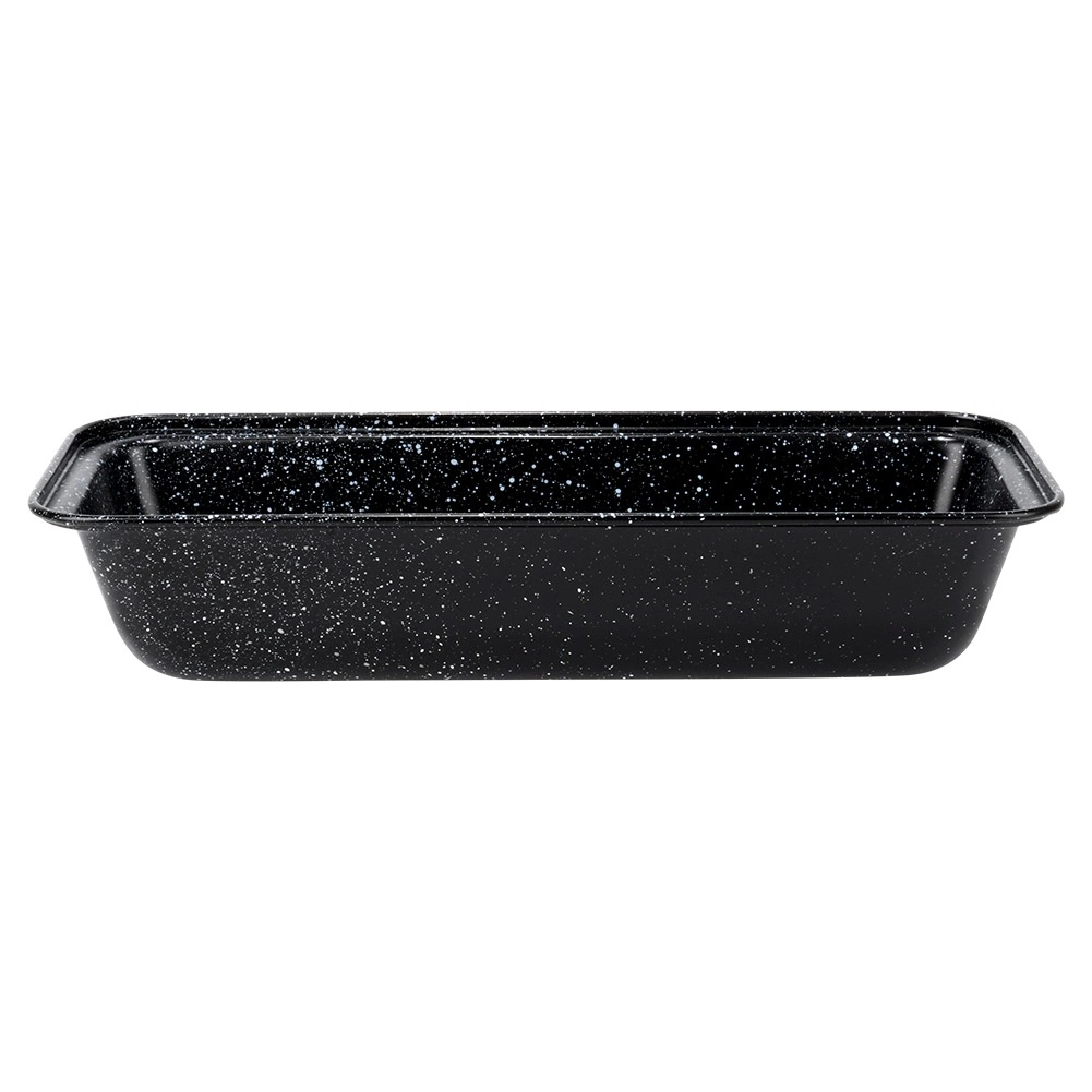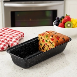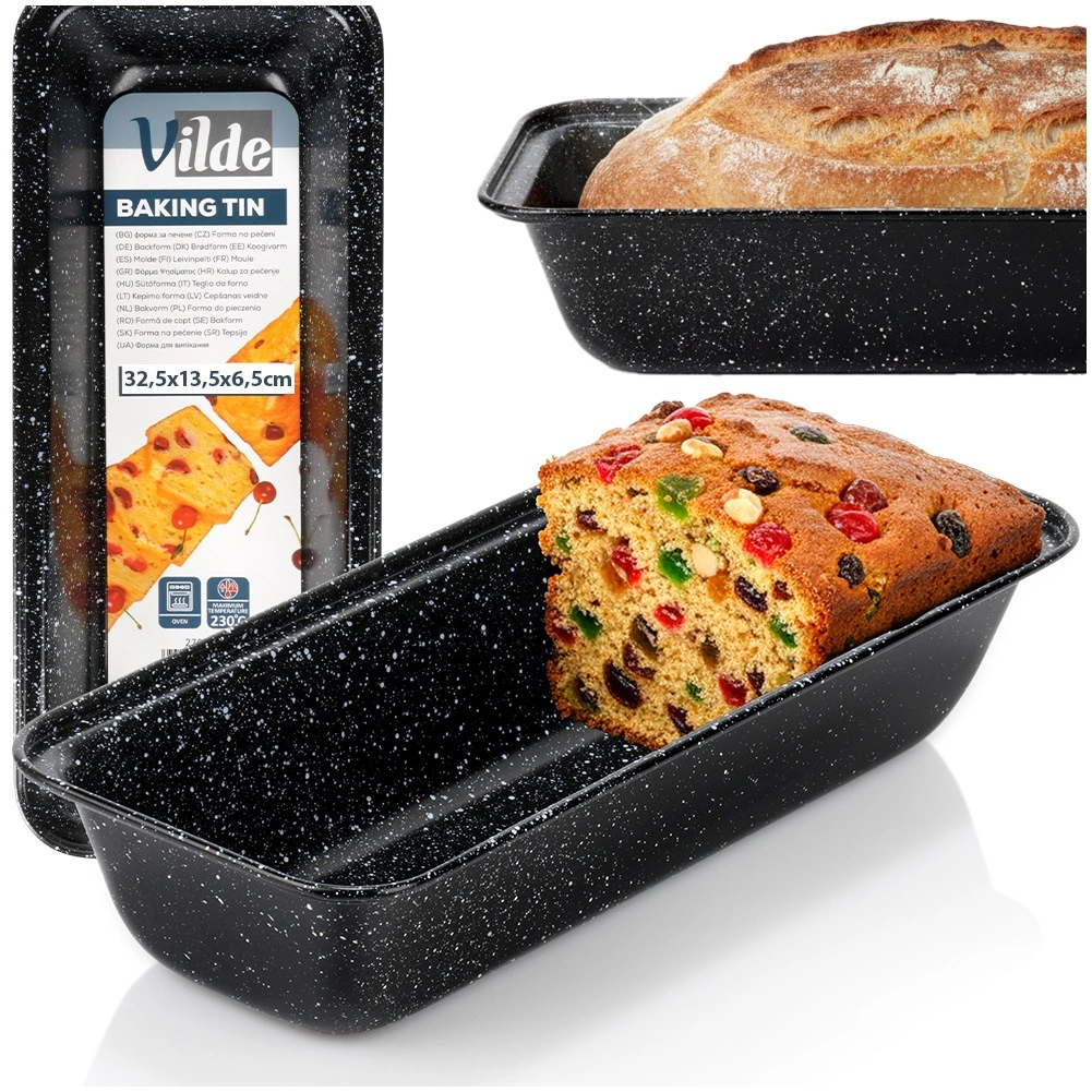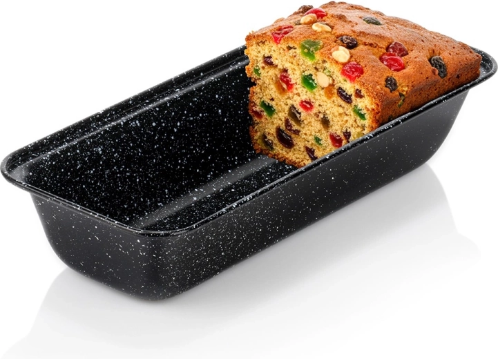 Praktická granitová forma na pečenie s rozmermi 32,5 × 13,5 × 6,5 cm na domáci chlieb, bábovky, biskupský chlebíček aj paštéty. Vyrobená z odolnej uhlíkovej ocele s nepriľnavou granitovou povrchovou úpravou pre ľahké vyklápanie, rovnomerné prepečenie a rýchle čistenie. Vhodná do plynových aj elektrických rúr do 230 °C.