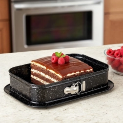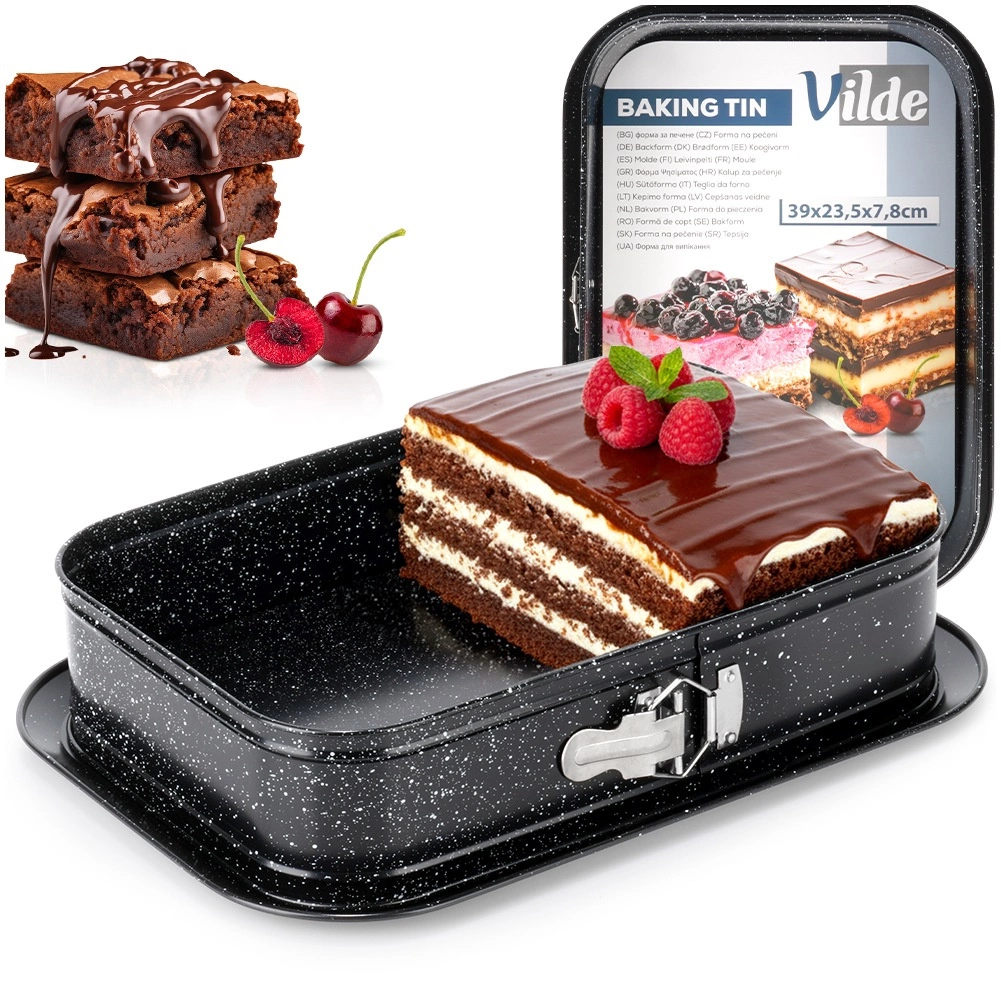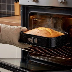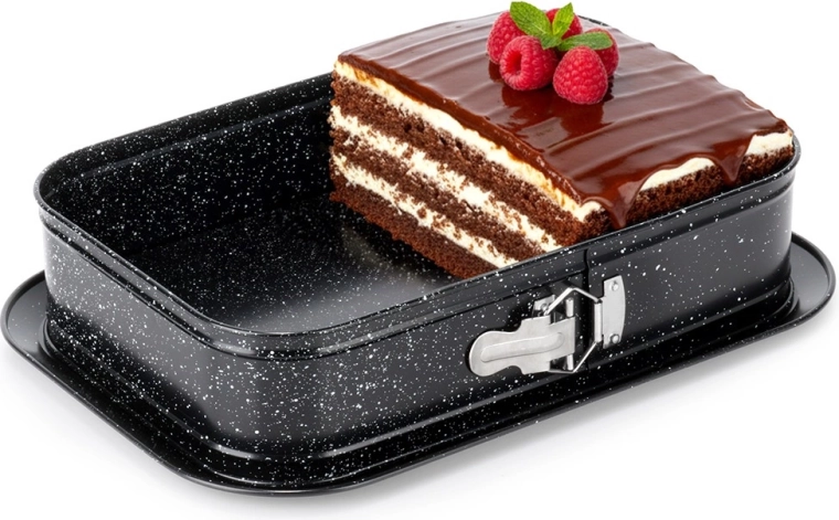 Obdĺžniková rozopínacia forma je skvelou voľbou na každodenné pečenie. Uhlíková oceľ s granitovou povrchovou úpravou odolá teplotám až 230 °C, nepohlcuje pachy a vďaka výbornej vodivosti rovnomerne rozvádza teplo. Rozopínací bok a vyberateľné dno umožnia bezproblémové vybratie aj krehkých dezertov bez poškodenia tvaru.