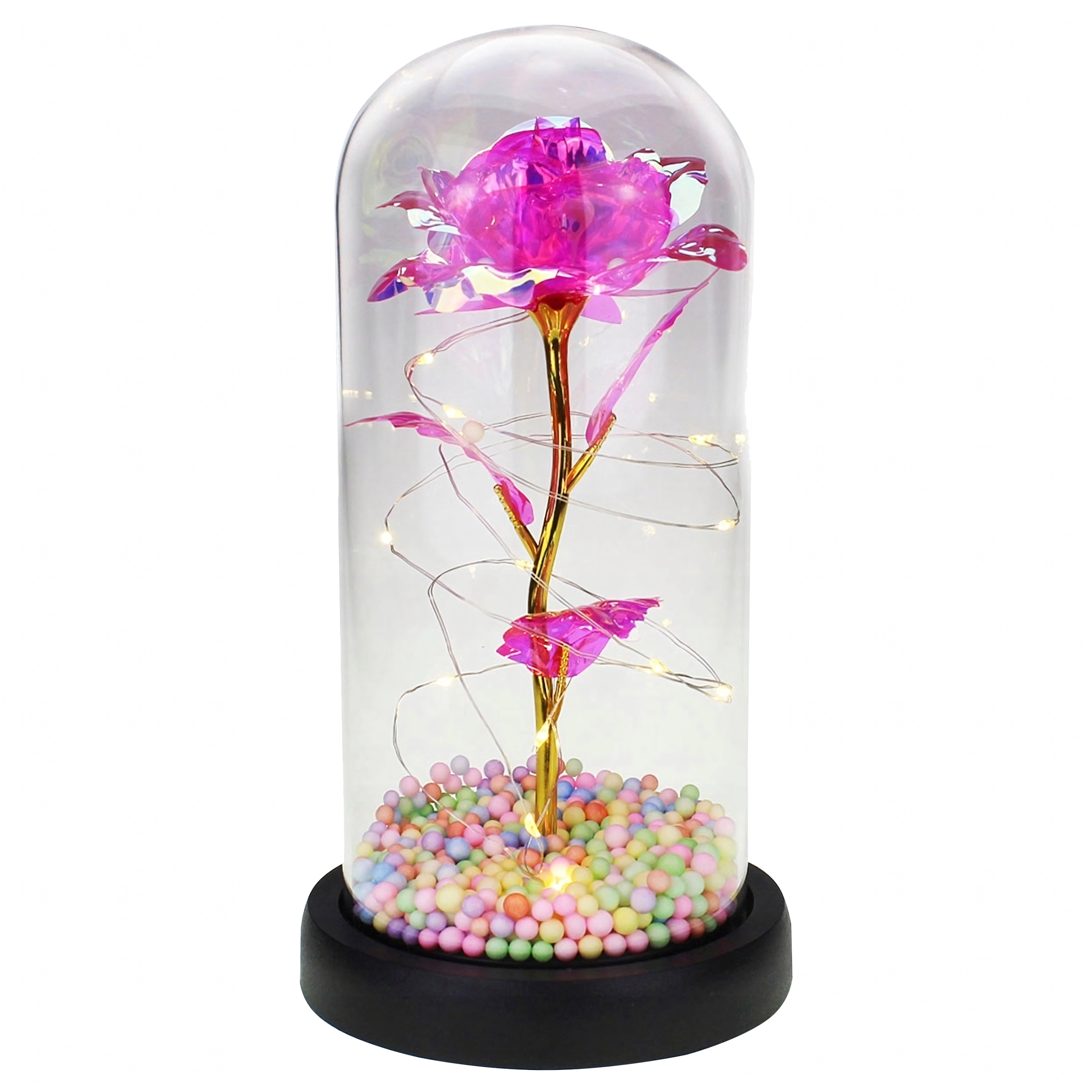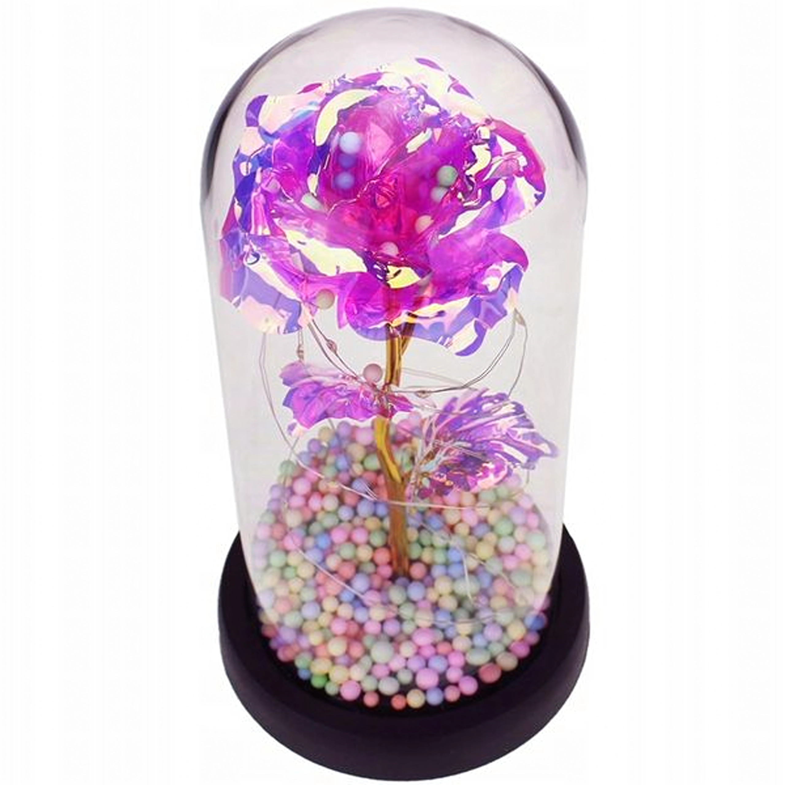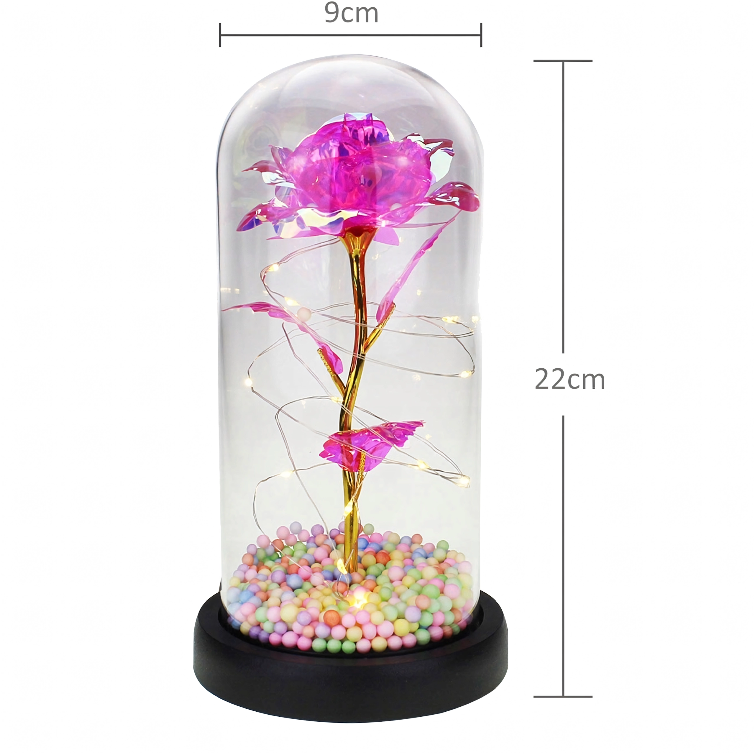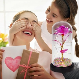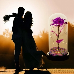 Elegantná LED ruža pod skleneným dómem rozžiari každý interiér teplým, trblietavým svetlom. Kombinuje moderné LED osvetlenie s nadčasovým symbolom lásky – ružou – a vytvára tak pôsobivý doplnok domova aj nezabudnuteľný darček. Dóm chráni kvet pred prachom a podčiarkuje jeho jemnú žiaru.