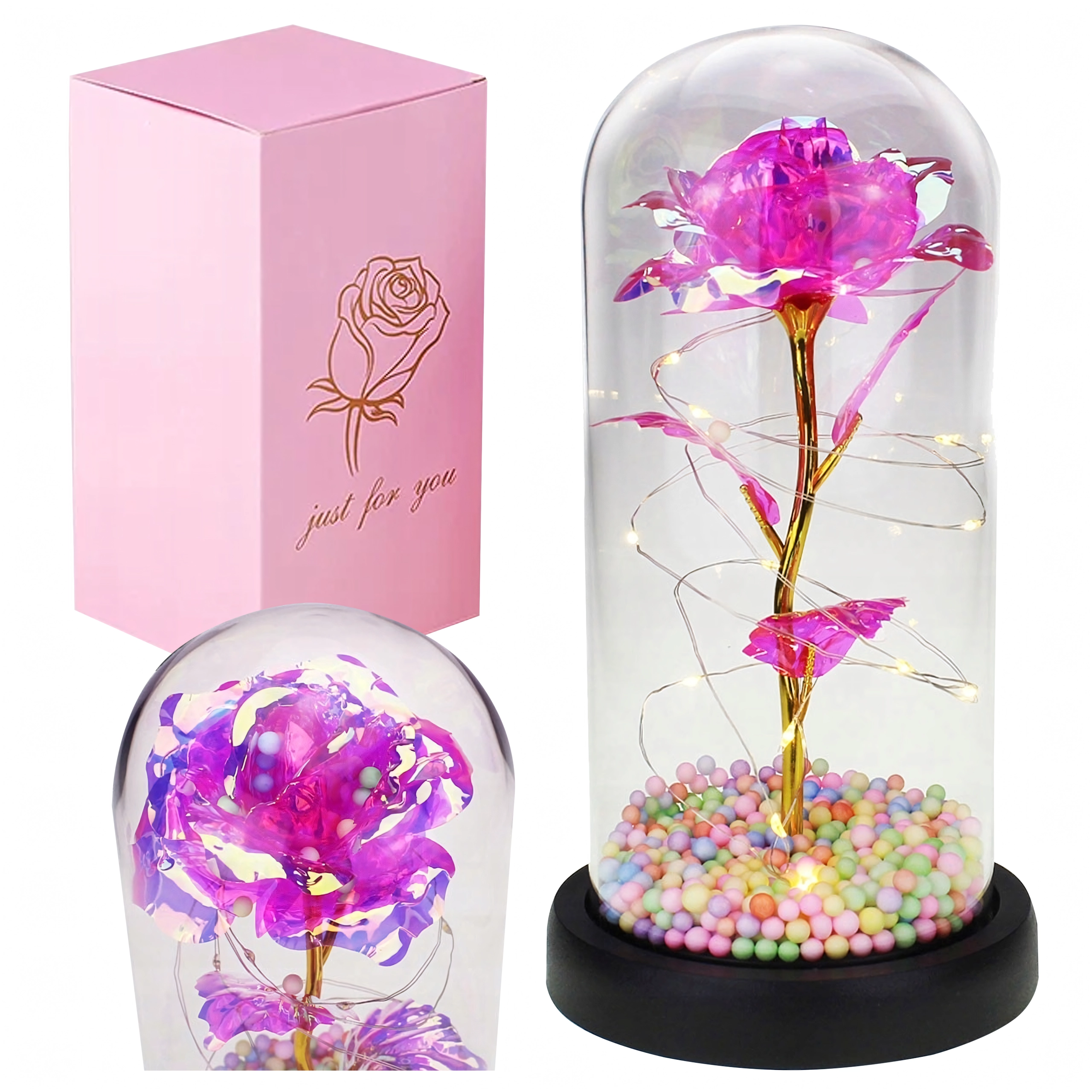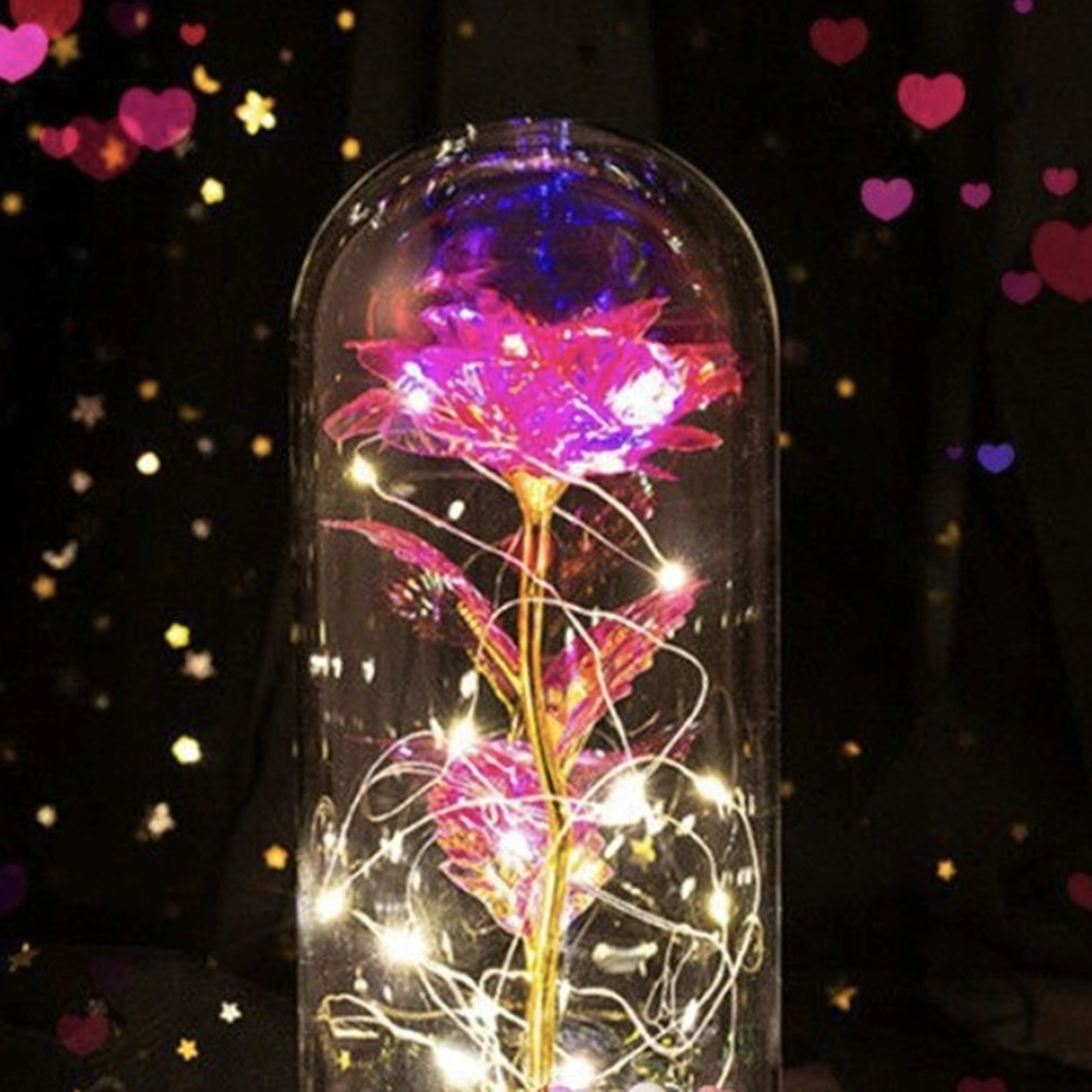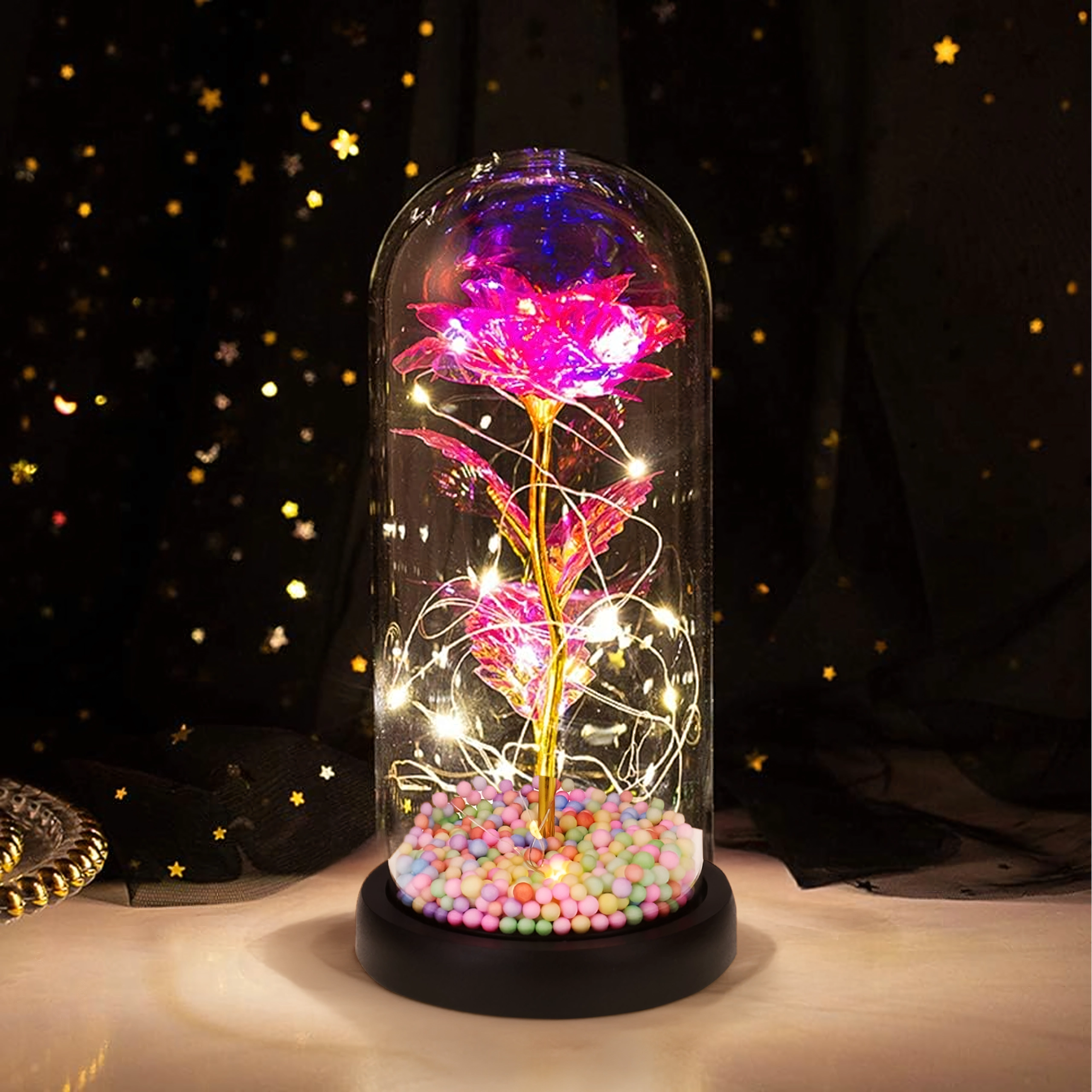 Elegantná LED ruža pod skleneným dómem rozžiari každý interiér teplým, trblietavým svetlom. Kombinuje moderné LED osvetlenie s nadčasovým symbolom lásky – ružou – a vytvára tak pôsobivý doplnok domova aj nezabudnuteľný darček. Dóm chráni kvet pred prachom a podčiarkuje jeho jemnú žiaru.