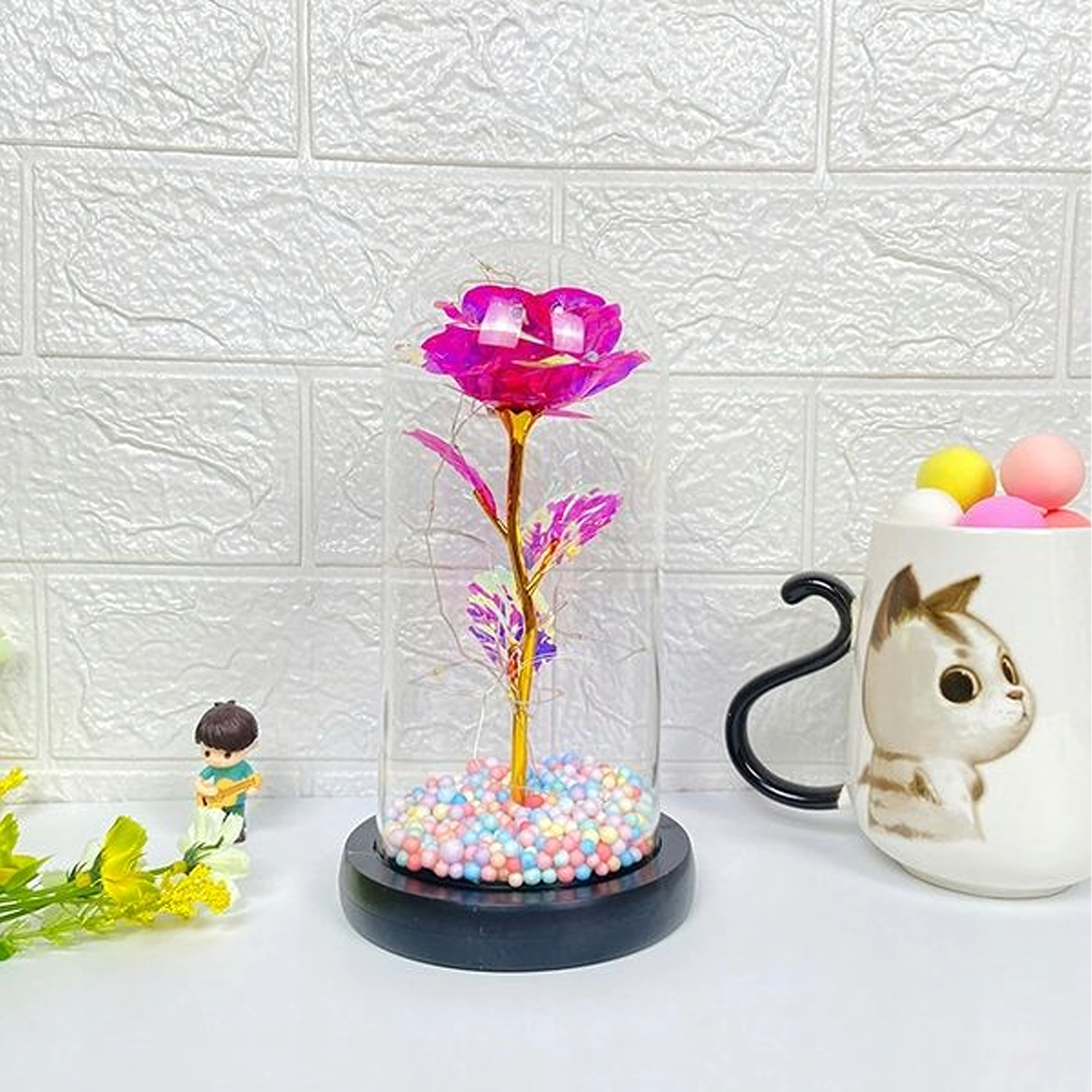 Dekorácia je pripravená na okamžité vystavenie: stabilný podstavec, drobné svetielka omotané okolo stonky a farebné perličky v základni tvoria harmonický celok. Vďaka batériovému napájaniu ju ľahko umiestnite na nočný stolík, poličku alebo slávnostný stôl bez blízkej zásuvky.