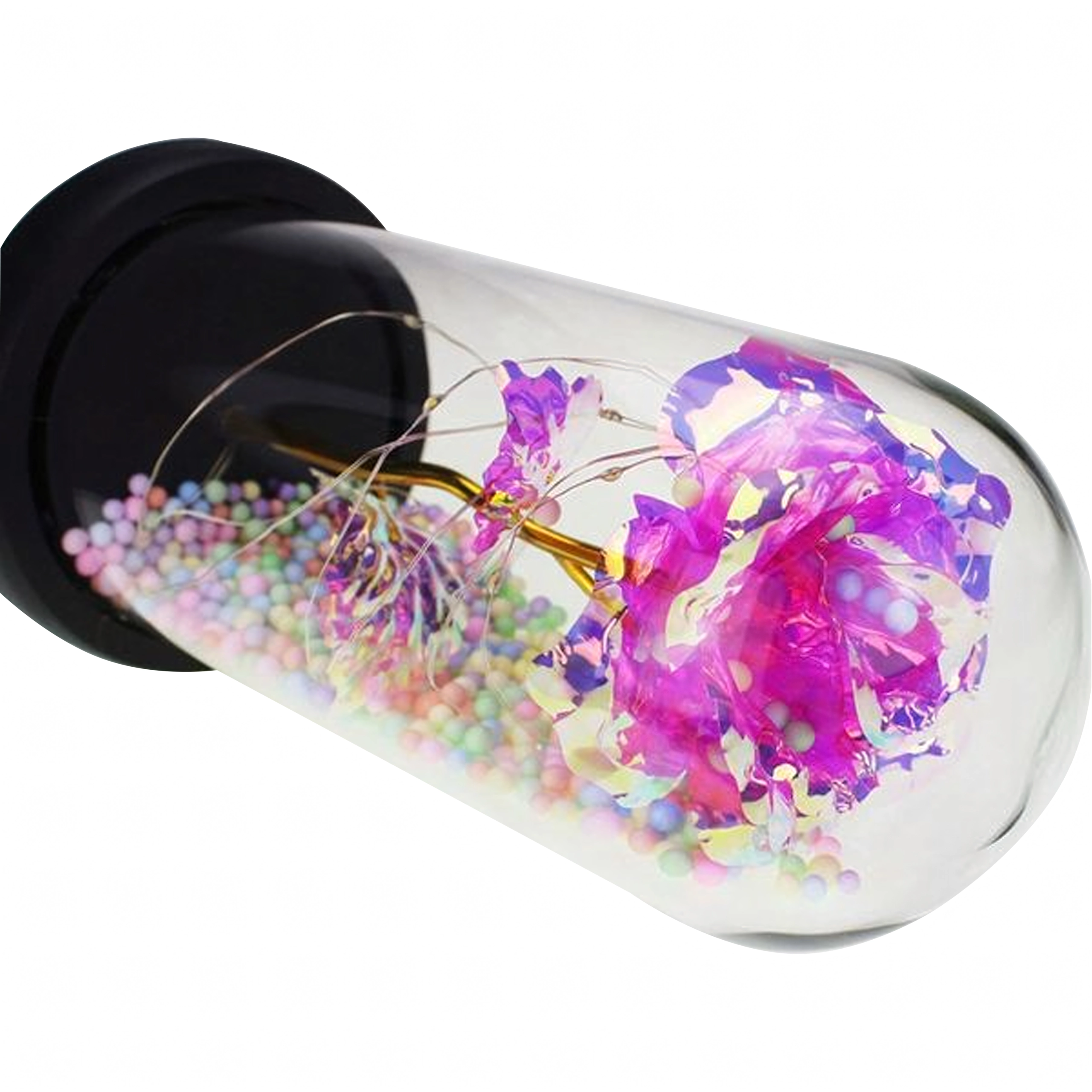 Iridescentný ružový kvet so zlatou stonkou je omotaný jemnými LED svetielkami, ktoré vytvárajú čarovný efekt aj bez ďalších dekorácií.