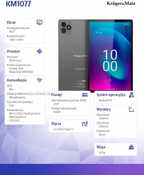 Ľahký a výkonný tablet KRÜGER&MATZ EAGLE s displejom 10,1" IPS je skvelý na prácu aj zábavu. Ponúka plynulý chod vďaka 8‑jadrovému procesoru, 4 GB RAM a 64 GB úložiska s možnosťou rozšírenia až o 512 GB. Vďaka LTE a dvojpásmovej Wi‑Fi budete online kdekoľvek, zatiaľ čo batéria 6000 mAh zaistí celodennú výdrž. Foto výbavu tvorí zadný 5 Mpx s autofokusom a predný 2 Mpx, systém Android prináša intuitívne ovládanie a prístup k tisícom aplikácií.