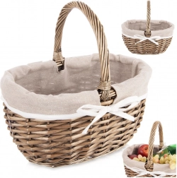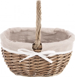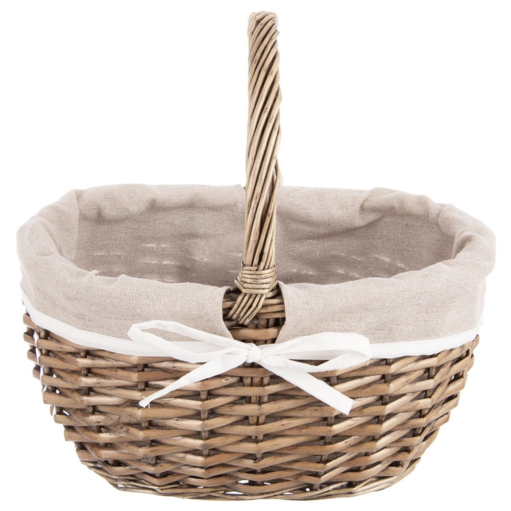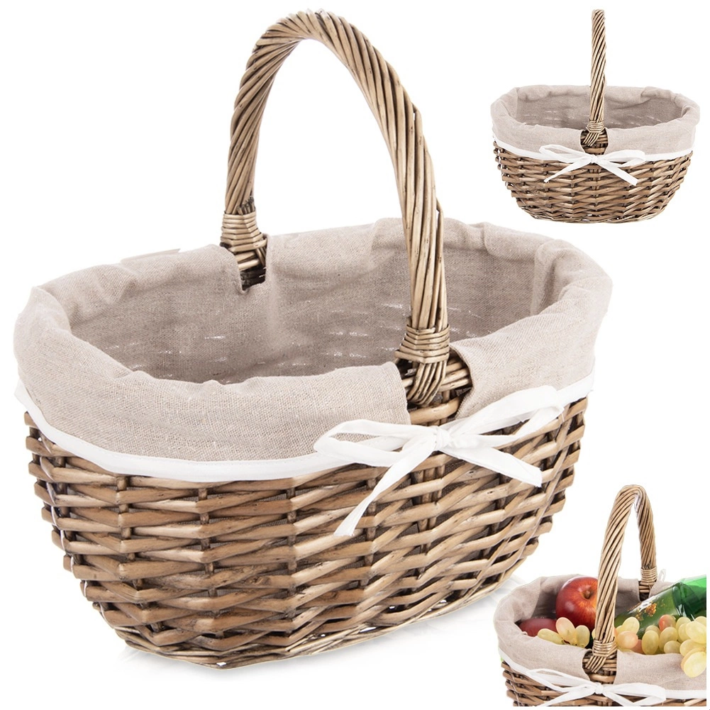Elegantný prútený kôš s pevnou rukoväťou a vyberateľnou látkovou vložkou je ideálny na piknik, nákupy aj domáce skladovanie. Ručne pletená prírodná vŕba zaručuje odolnosť a jedinečný vzhľad, béžová textilná podšívka s bielou stužkou dodáva košu šmrnc a možno ju ľahko vyprať. Praktické rozmery 32,5 × 24 × 32 cm uľahčia prenášanie aj organizáciu vecí.