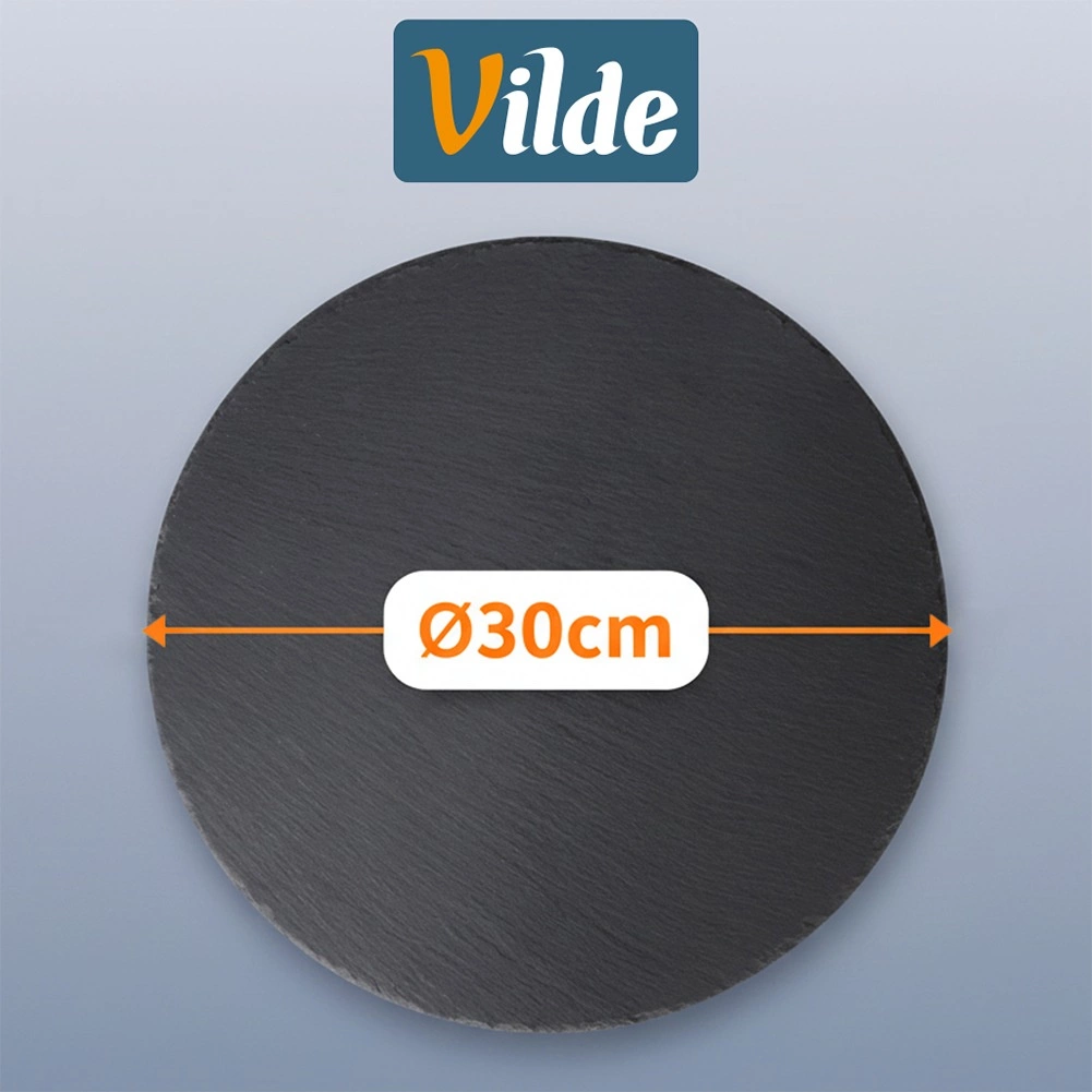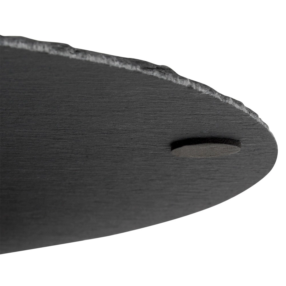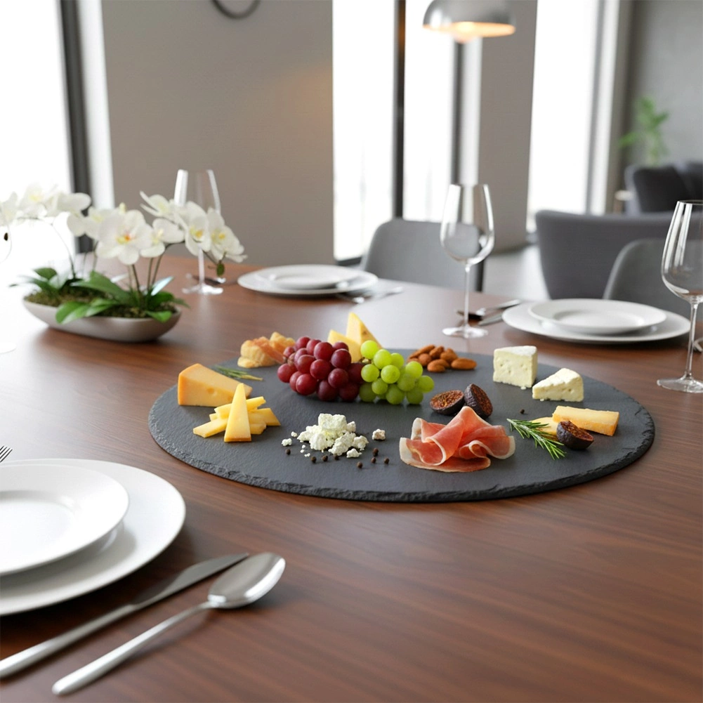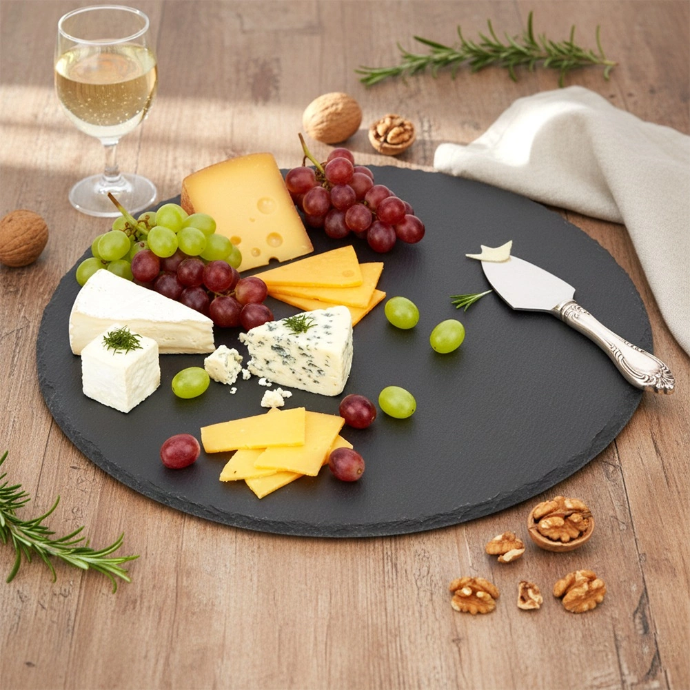 Táto okrúhla bridlicová servírovacia tácka prináša na stôl prirodzenú eleganciu a funkčnosť. Prírodná čierna bridlica s jemne štiepanou štruktúrou a ručne opracovanými hranami pôsobí atraktívne a zvýrazní servírované pokrmy. Vďaka protišmykovým nožičkám zostáva stabilná a chráni povrch stola pred poškriabaním.