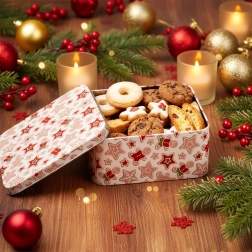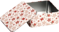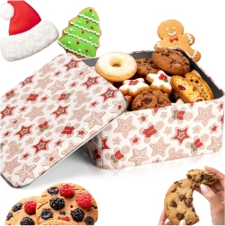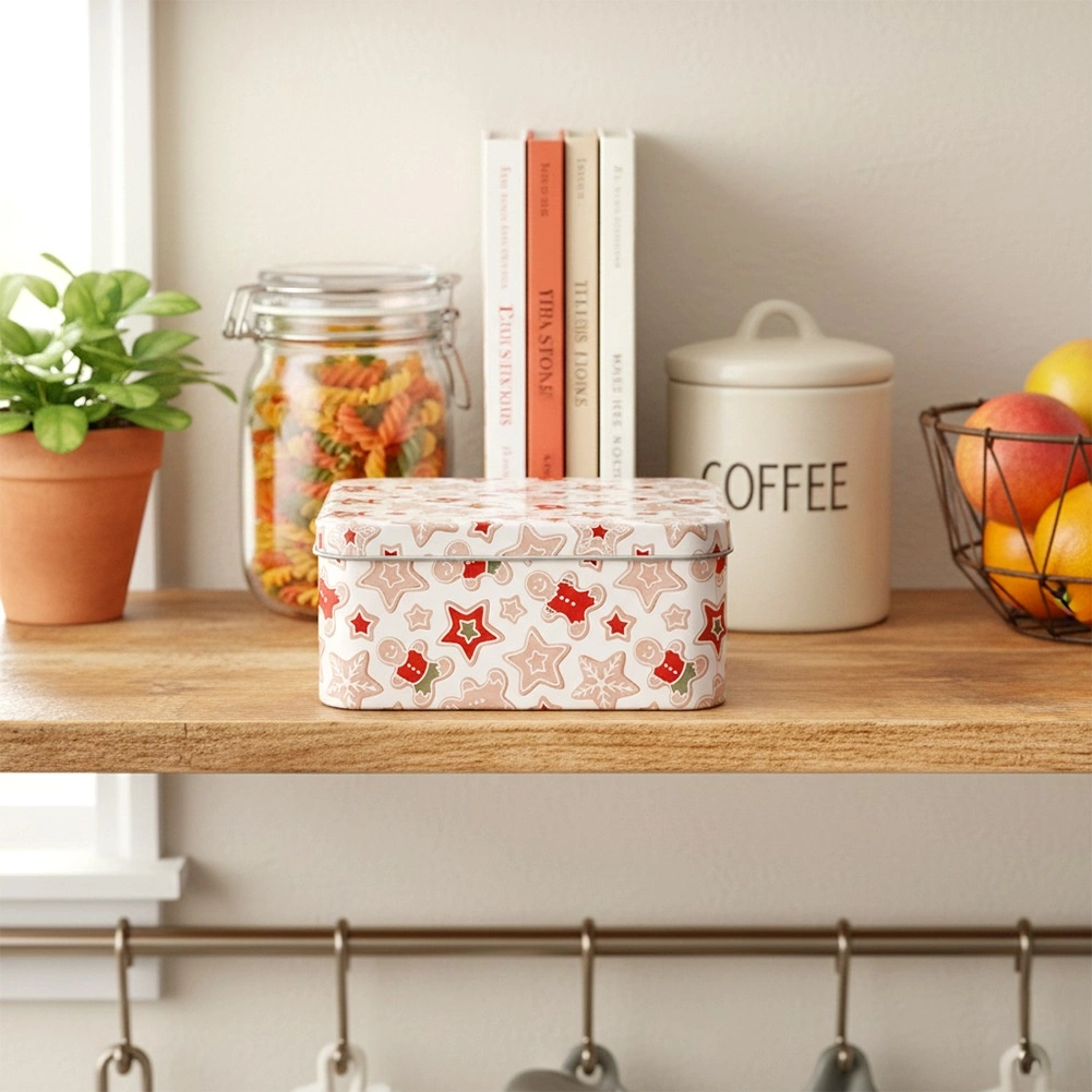 Táto štvorcová kovová dóza s jemným vianočným vzorom perníčkov, hviezdičiek a zimných motívov je skvelá na každodenné aj sezónne použitie. Vďaka pevnému veku pomáha udržať uložené dobroty dlhšie čerstvé a chránené.
