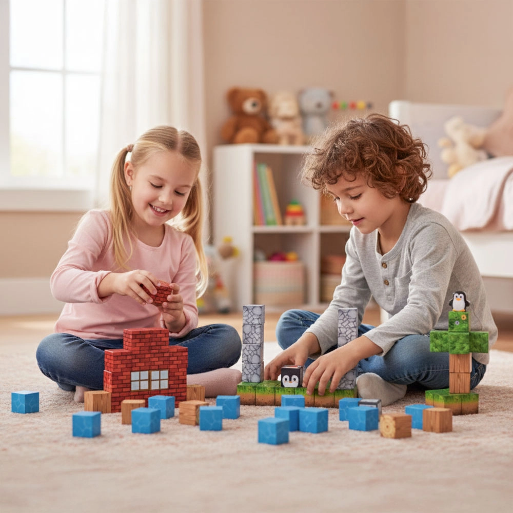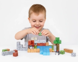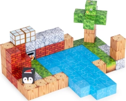 Táto sada farebných magnetických kociek umožňuje deťom stavať veže, domčeky, mosty aj celé voxelové krajiny. Vďaka vstavaným magnetom sa dieliky rýchlo a isto spoja zo všetkých strán – bez frustrácie a s okamžitým úspechom. Kocky s potlačami trávy, dreva, kameňa a vody podporujú kreatívne hranie a vytváranie tematických scén.