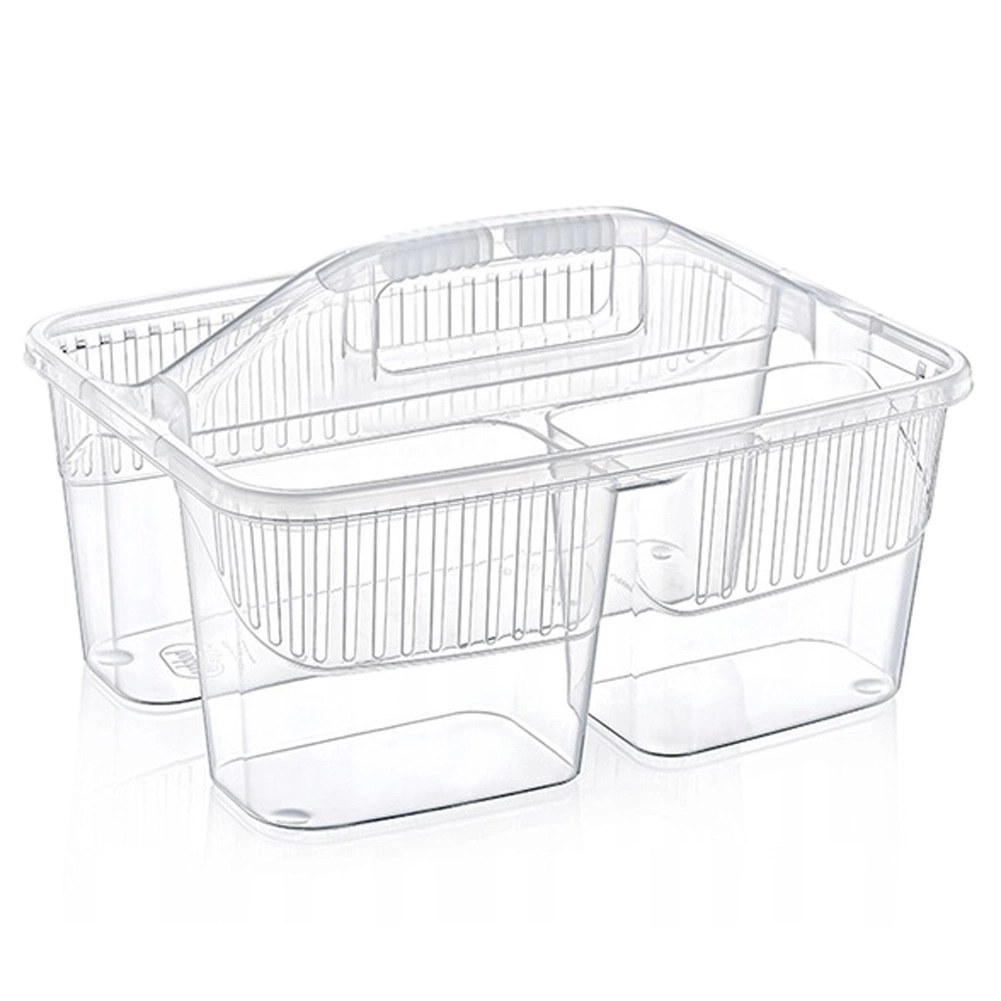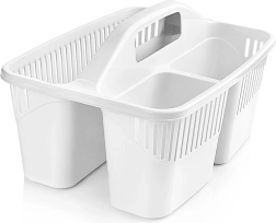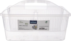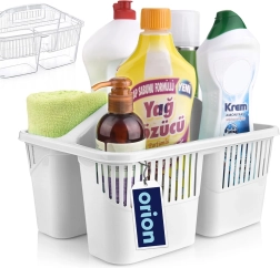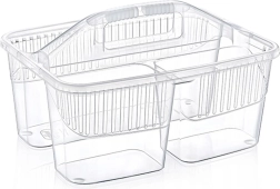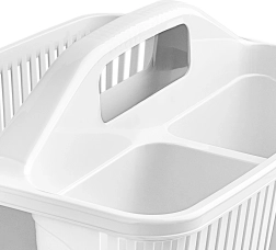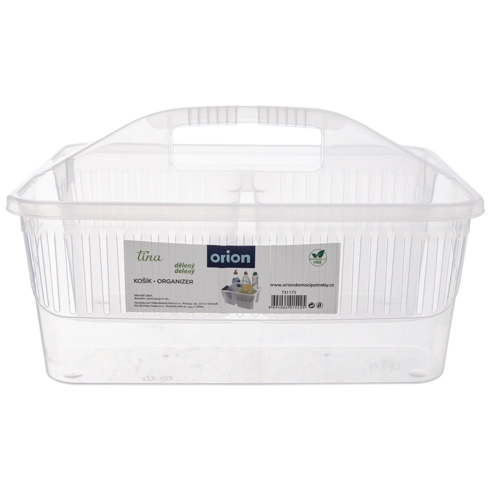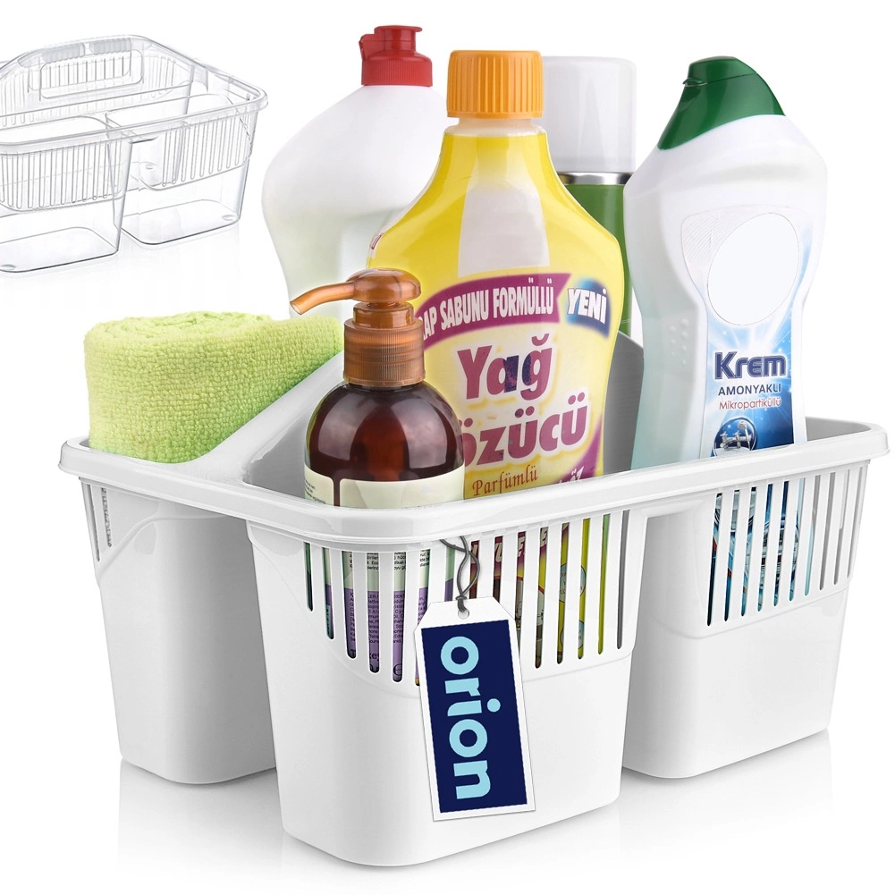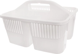Udržte si poriadok pri upratovaní vďaka kompaktnému organizéru na detergenty s tromi oddelenými priehradkami. Vďaka pevnému stredovému uchu ľahko prenesiete všetky potrebné prostriedky, kefy aj hubky z miestnosti do miestnosti. Košík je vyrobený z kvalitného plastu v bielej alebo transparentnej variante (odosielame náhodne), je ľahký, odolný a ľahko sa udržiava v čistote.