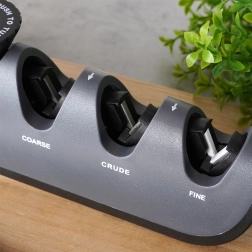 Štyri zóny brúsenia vám umožnia postupovať krok za krokom: Coarse na obnovu silne otupenej hrany, Crude na klasické ostrenie, Fine (keramika) na jemné doostrenie a finálne leštenie a samostatná diamantová zóna pre nožnice. Kompaktné rozmery uľahčujú uloženie aj v kuchynskej zásuvke, napriek tomu je nástroj odolný a ľahký na každodenné používanie.