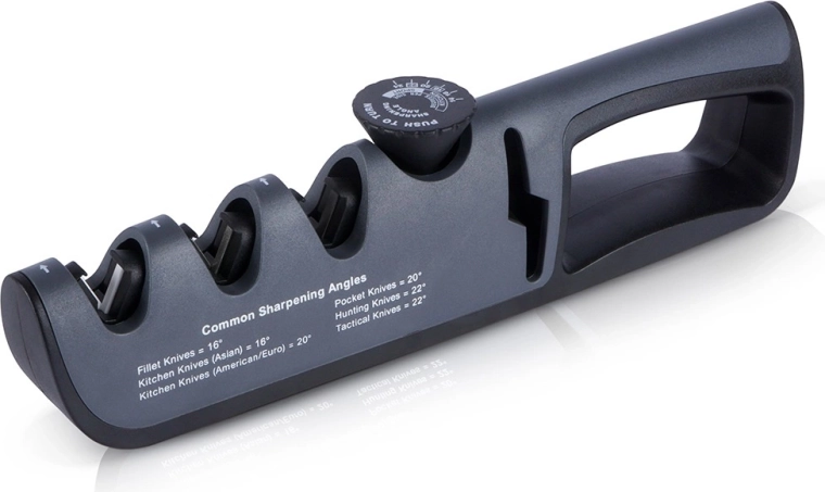 Otočné koliesko umožňuje nastaviť ideálny uhol pre kuchynské nože (14–20°), EDC a zatváracie nože (20–22°) alebo robustnejšie outdoorové a lovecké čepele (22–24°).