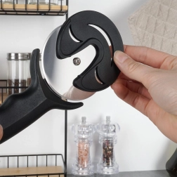 Vďaka hladkému povrchu kotúča sa cesto nelepí a rotačný mechanizmus zaručí čisté a rovné rezy. Praktický otvor na konci rukoväti umožňuje zavesenie napríklad na kuchynskej lište. Vyrobené z materiálov bezpečných pre styk s potravinami a podľa európskych štandardov.