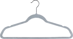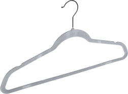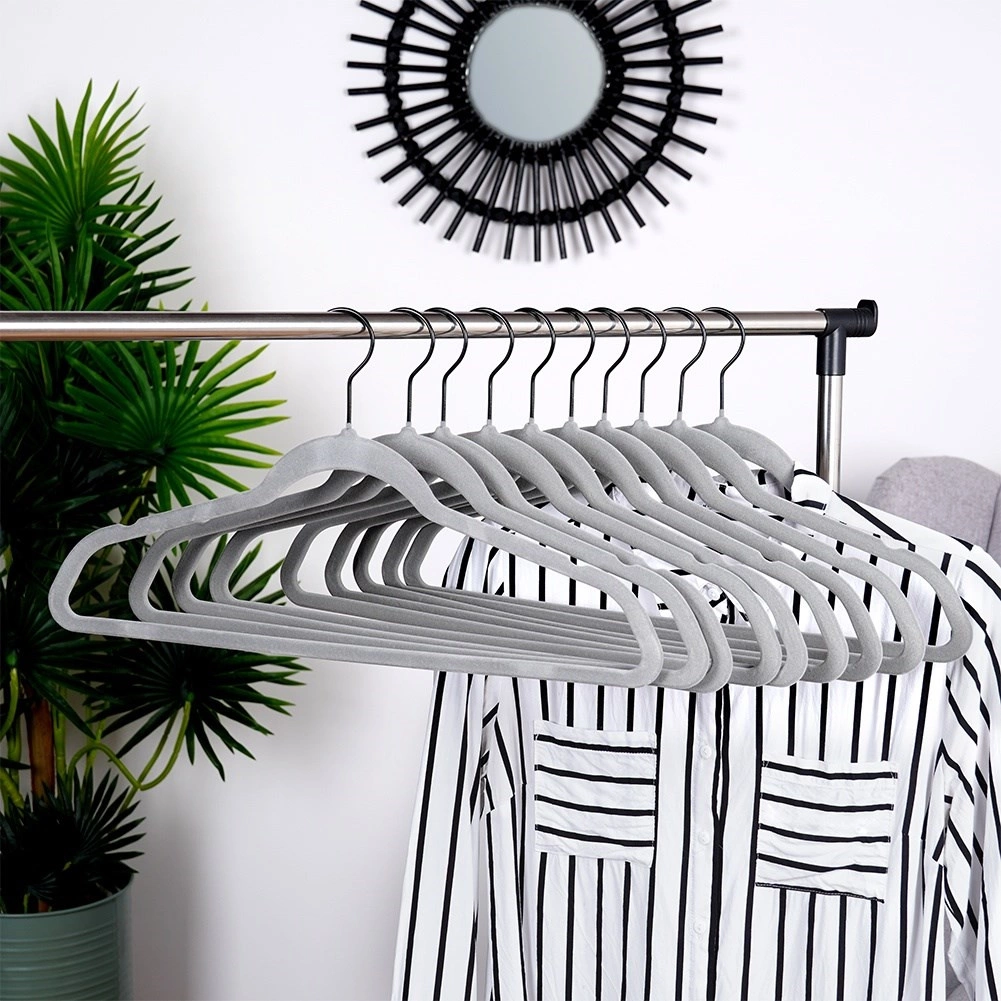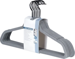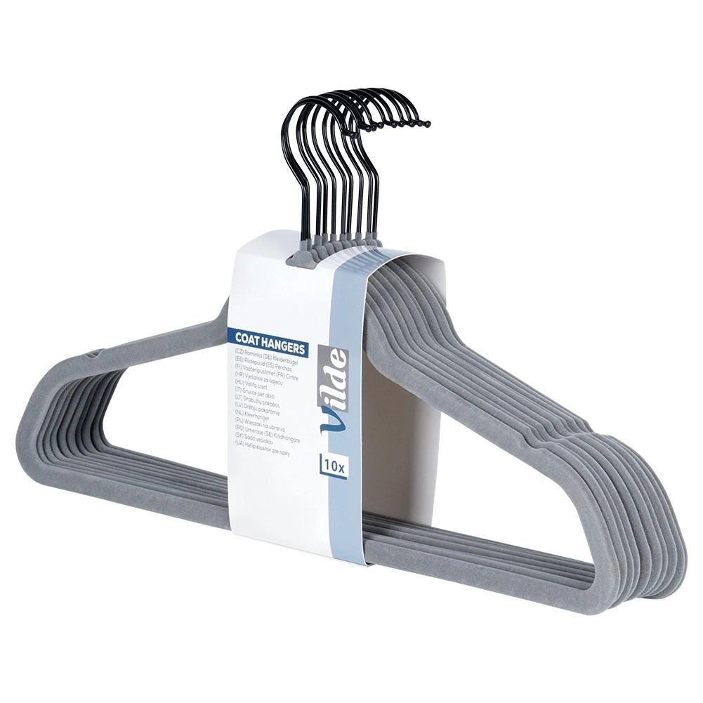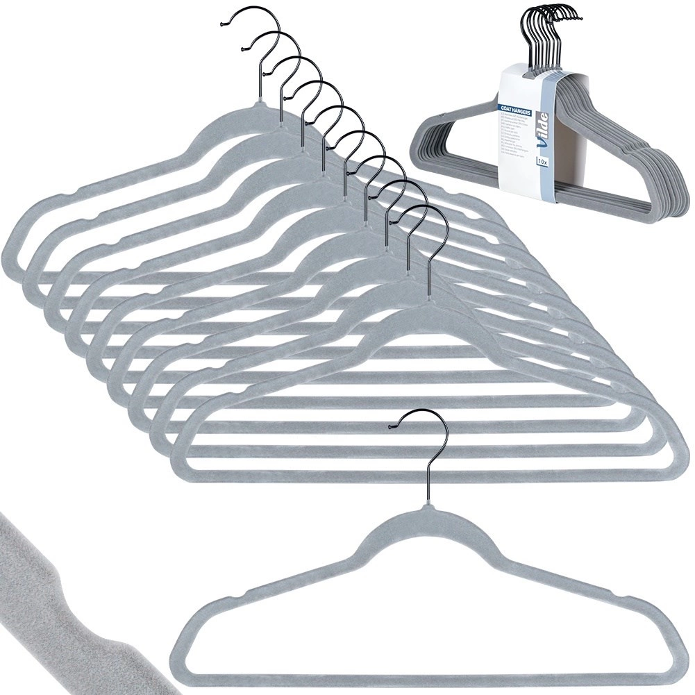 Sivé zamatové vešiaky Vilde šetria miesto a spoľahlivo držia odevy bez skĺzavania. Protišmykový velúr, otočný kovový háčik a univerzálna veľkosť 45 × 24,5 cm pre košele, šaty aj kabáty. Praktické balenie 10 ks pre jednoduchú organizáciu skrine.
