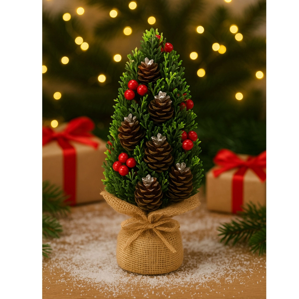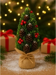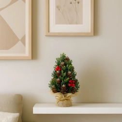 Elegantný mini vianočný stromček je ideálnou voľbou pre tých, ktorí chcú rýchlo a efektne dozdobiť interiér. Husté zelené vetvičky dopĺňajú prírodné šišky a výrazné červené bobule, ktoré dodávajú dekorácii prírodný a slávnostný vzhľad. Jutová základňa podčiarkuje rustikálny štýl a zaisťuje jednoduché zladenie s ostatným vianočným dekorovaním.