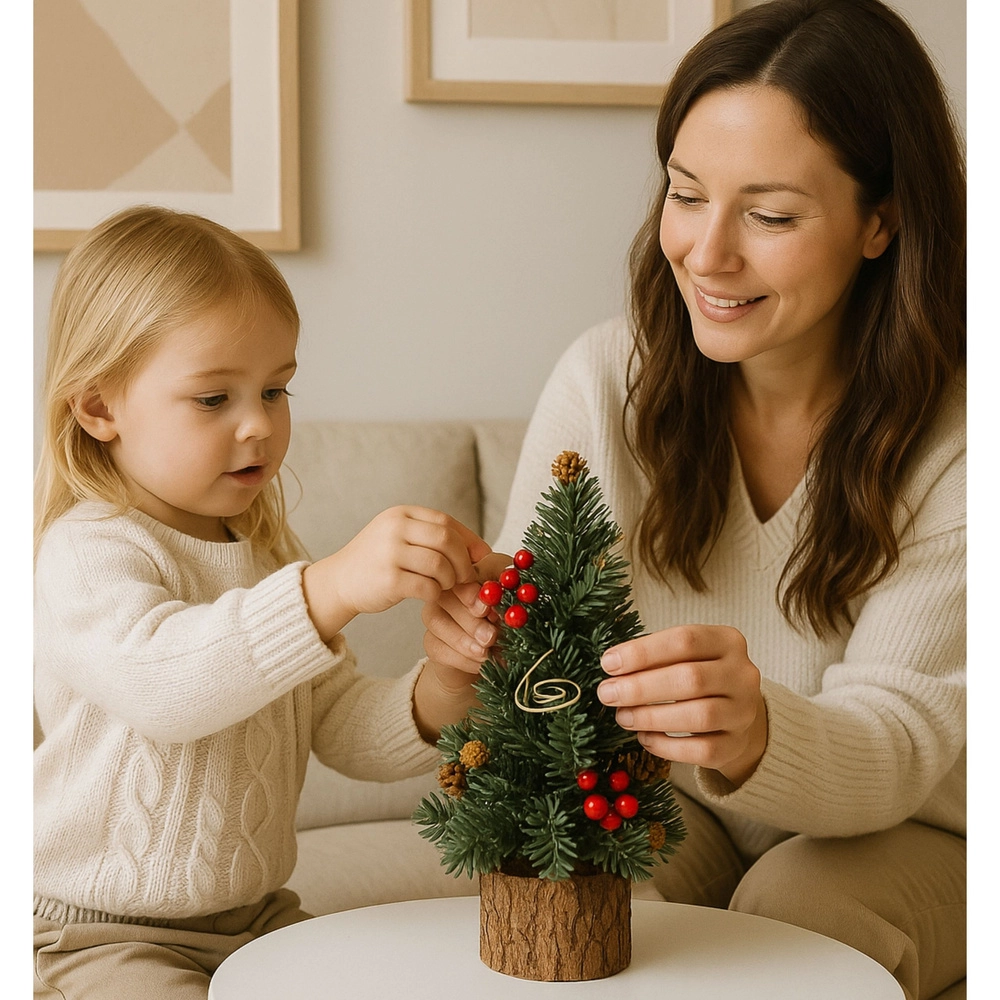Dodajte interiéru okamžitú sviatočnú atmosféru. Tento malý vianočný stromček s realistickým ihličím, červenými bobuľami a prírodnými šiškami sa skvele hodí na stôl, komodu aj recepciu. Pevná drevená základňa zaisťuje stabilitu, zatiaľ čo kompaktná veľkosť šetrí miesto a zároveň pôsobí efektne.