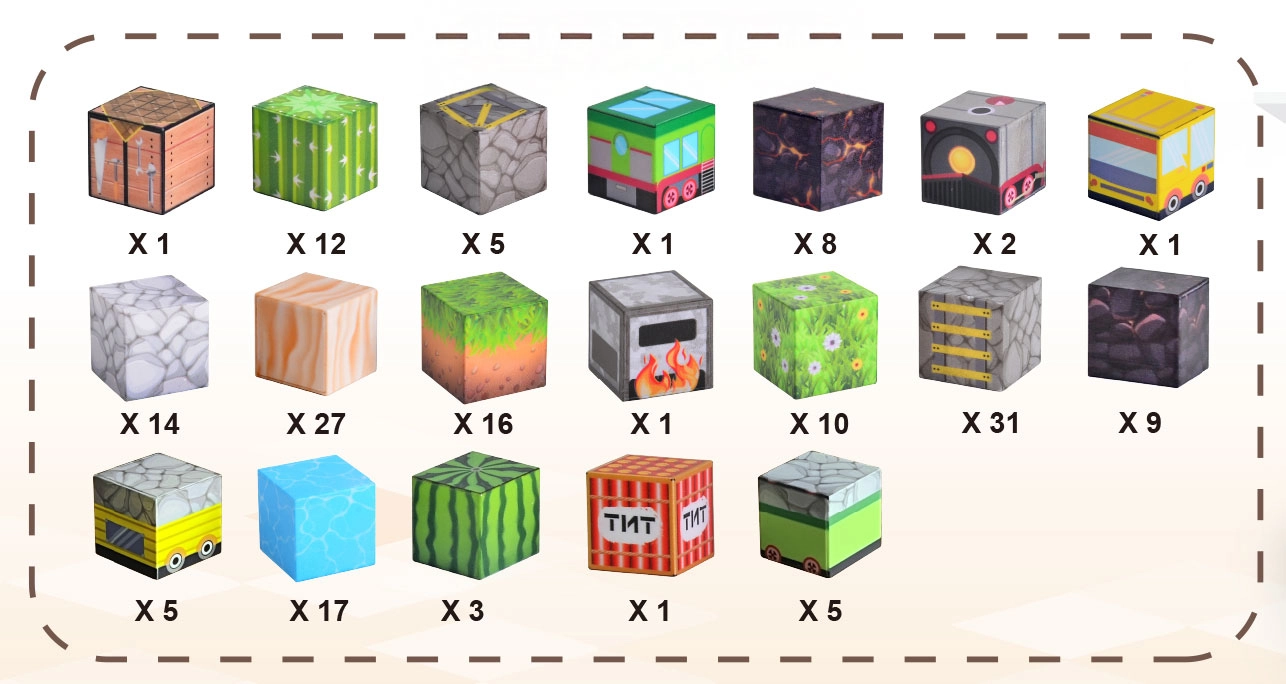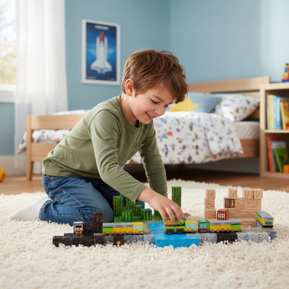Farebné kocky s potlačami trávy, vody, dreva či kameňa umožňujú stavať krajiny, mosty a trate pre nekonečnú hru.