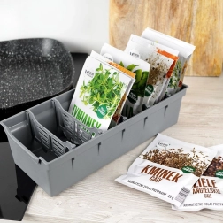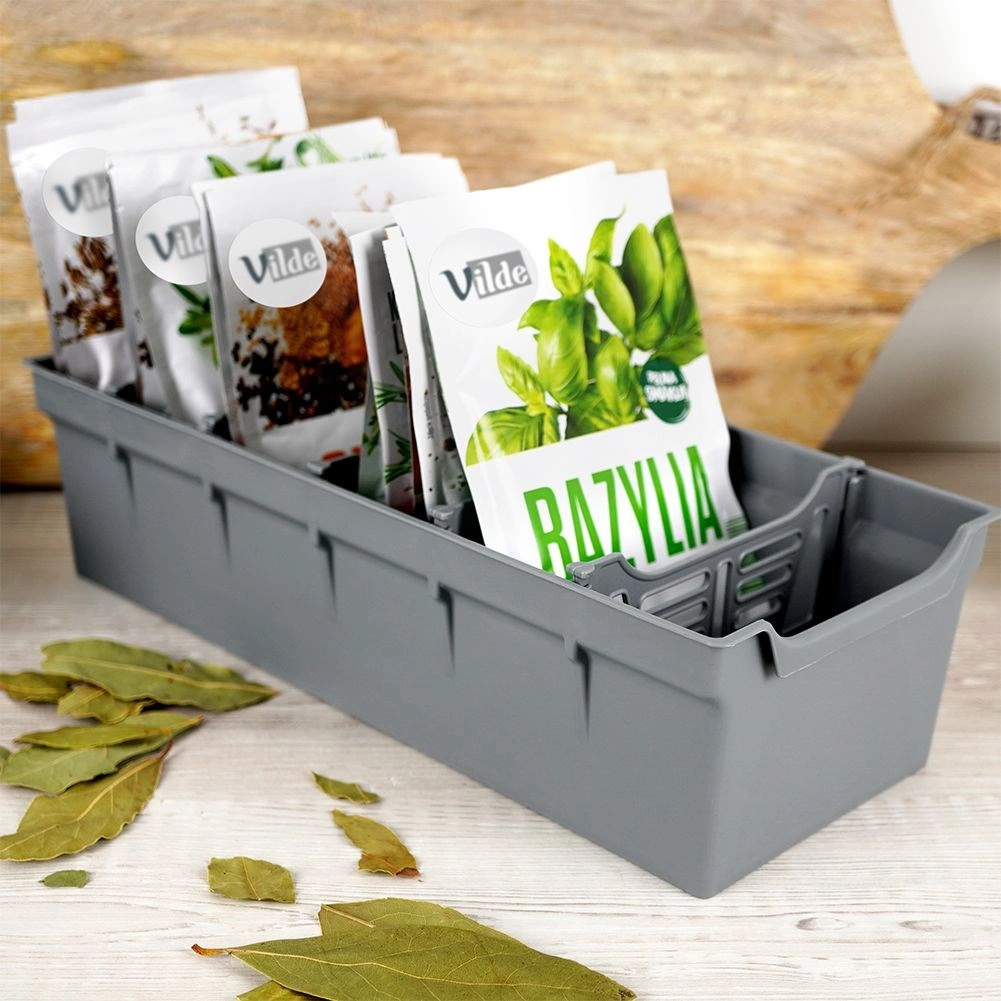 Organizér je vyrobený z kvalitného, odolného plastu v elegantnej sivej farbe. Vo vnútri nájdete päť vyberateľných prepážok, ktoré rozdeľujú priestor na šesť častí – ľahko si tak vytvoríte oddelenie pre rôzne druhy korenia a rýchlo nájdete presne to, čo potrebujete. Skvelý nielen pre zatvorené, ale aj načaté vrecúška.