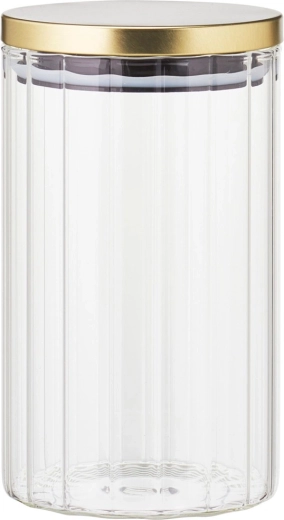 Elegantná a funkčná nádoba na každodenné skladovanie v kuchyni. Priehľadné borosilikátové sklo umožní okamžitú kontrolu obsahu a zároveň efektné vystavenie potravín. Kovové viečko v zlatej farbe so silikónovým tesnením zabezpečuje vzduchotesné uzavretie a dlhšiu čerstvosť.