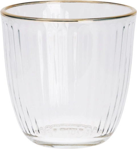 Elegantný pohár s objemom 250 ml z kvalitného, pevného skla s ryhovaným povrchom a zlatým rantlom. Skvele sa hodí na vodu, limonády, drinky aj džúsy a ozdobí každý stôl doma, v reštaurácii aj v bare.