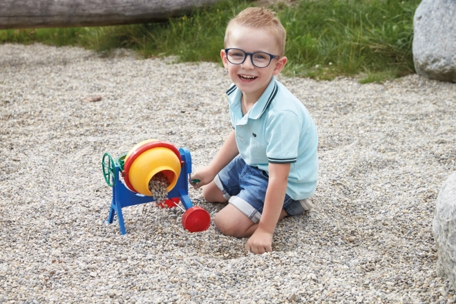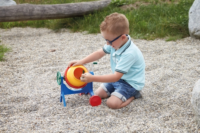 Táto farebná detská miešačka verne napodobňuje skutočný stavebný stroj. Pomocou bočnej kľuky možno jednoducho otáčať bubnom a miešať piesok či drobné kamienky. Vďaka stabilnému rámu a hladkým hranám je hra bezpečná a zábavná.