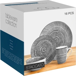 Táto 16‑dielna porcelánová súprava kombinuje elegantný vzhľad s praktickou funkčnosťou. Biely podklad dopĺňa moderný čierny geometrický motív, ktorý sa ľahko ladí s ďalšími doplnkami na stole. Kvalitný porcelán je príjemný na dotyk, odolný pri každodennom používaní a ľahko sa udržiava.