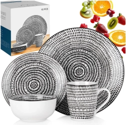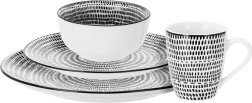 Štýlová porcelánová jedálenská súprava pre 4 osoby v modernom čierno‑bielom dizajne. Obsahuje taniere, misky a hrnčeky pre kompletné stolovanie. Je vhodná do umývačky aj mikrovlnky, má odolné prevedenie a efektný geometrický vzor, ktorý pozdvihne každodenný aj sviatočný stôl.