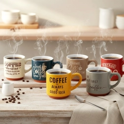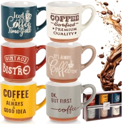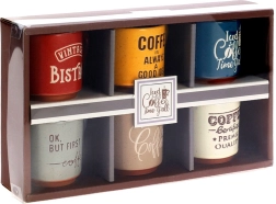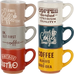 Štýlová sada šiestich keramických šálok na espresso s objemom 110 ml v rôznych farbách s nápismi. Ponúka odolnú keramiku, pohodlné uško a je vhodná do umývačky aj mikrovlnky – ideálna na každodenné kávové rituály doma aj v kancelárii.