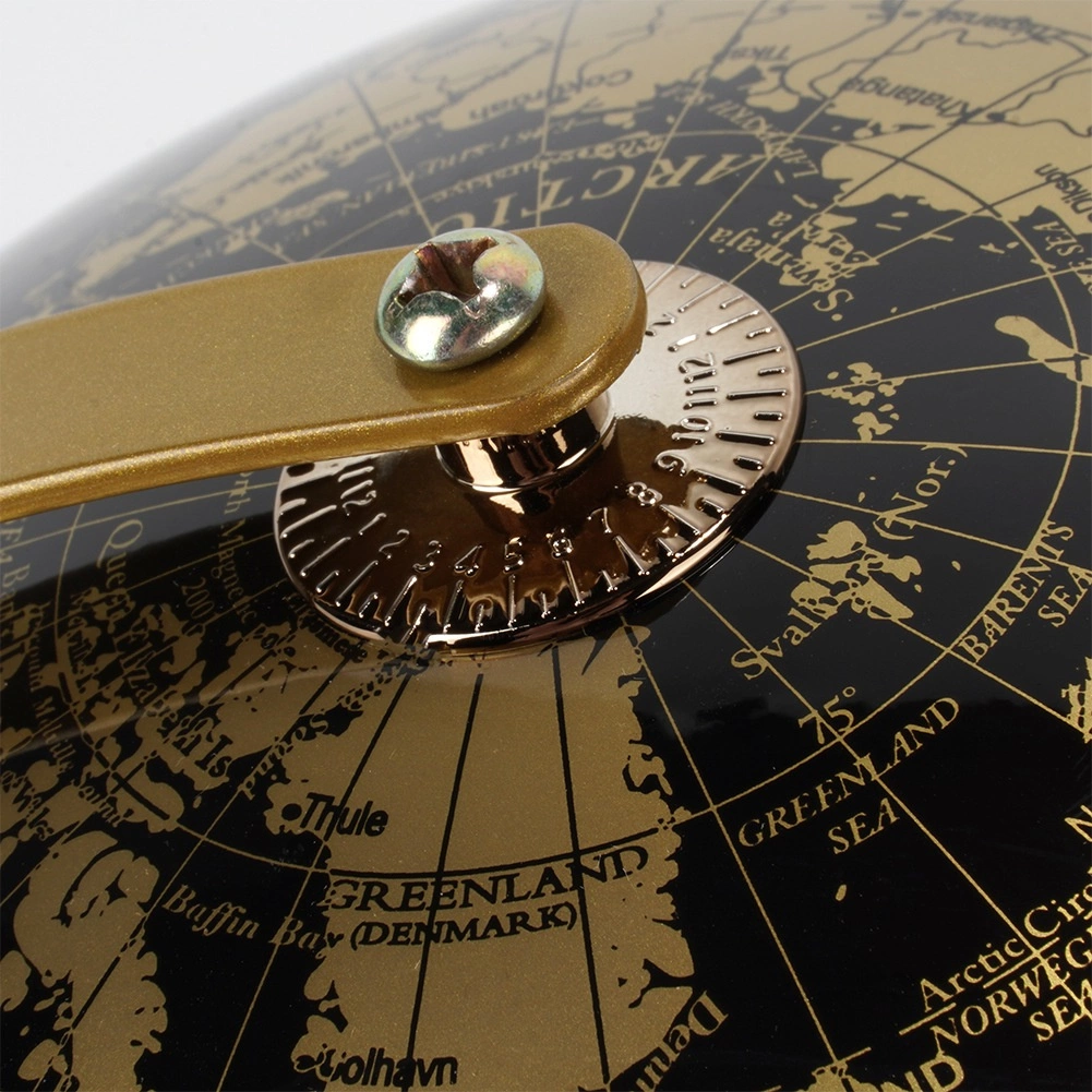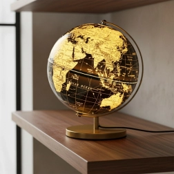 Detailné prevedenie glóbusu v čiernej a zlatej farbe a stabilná kovová základňa dodajú vášmu interiéru moderný a luxusný akcent.