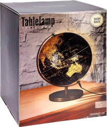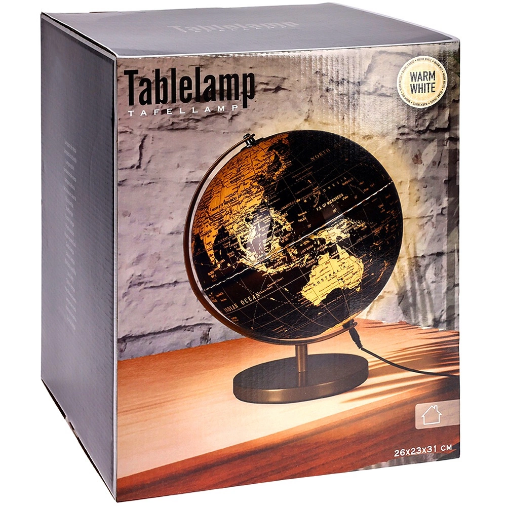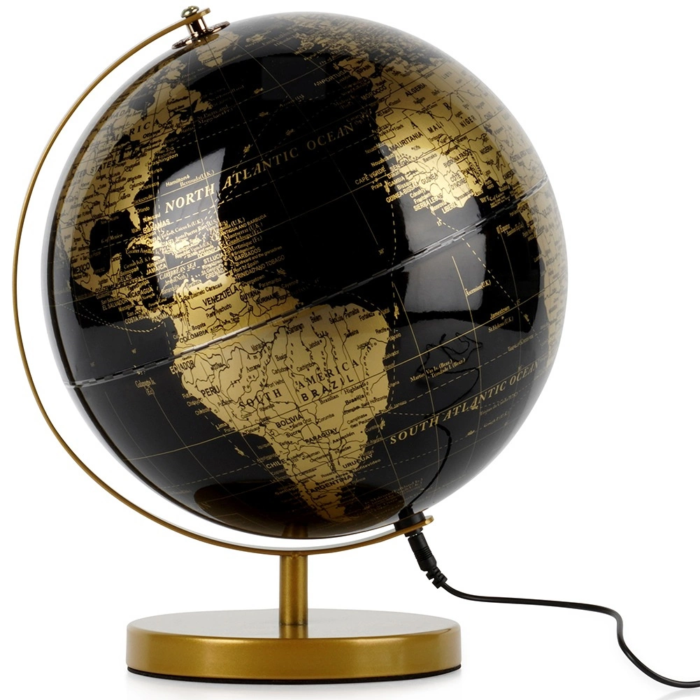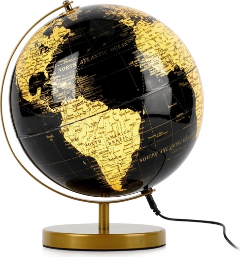 Elegantná stolná lampa v tvare glóbusu s rozmermi 26 × 25 × 31 cm prináša do interiéru štýl aj funkčnosť. Kombinácia čiernej a zlatej farby, kovová stabilná základňa a teplé biele LED osvetlenie vytvoria príjemnú atmosféru na relax aj prácu. Lampa má napájanie cez USB s káblom s dĺžkou 1 m a protišmykovú filcovú podložku na ochranu nábytku.