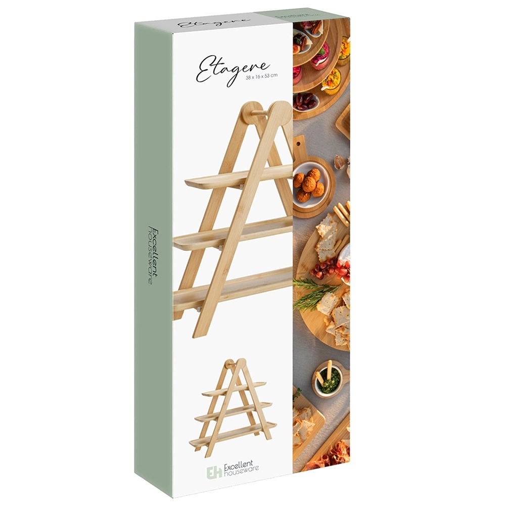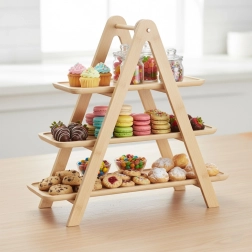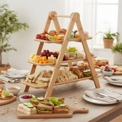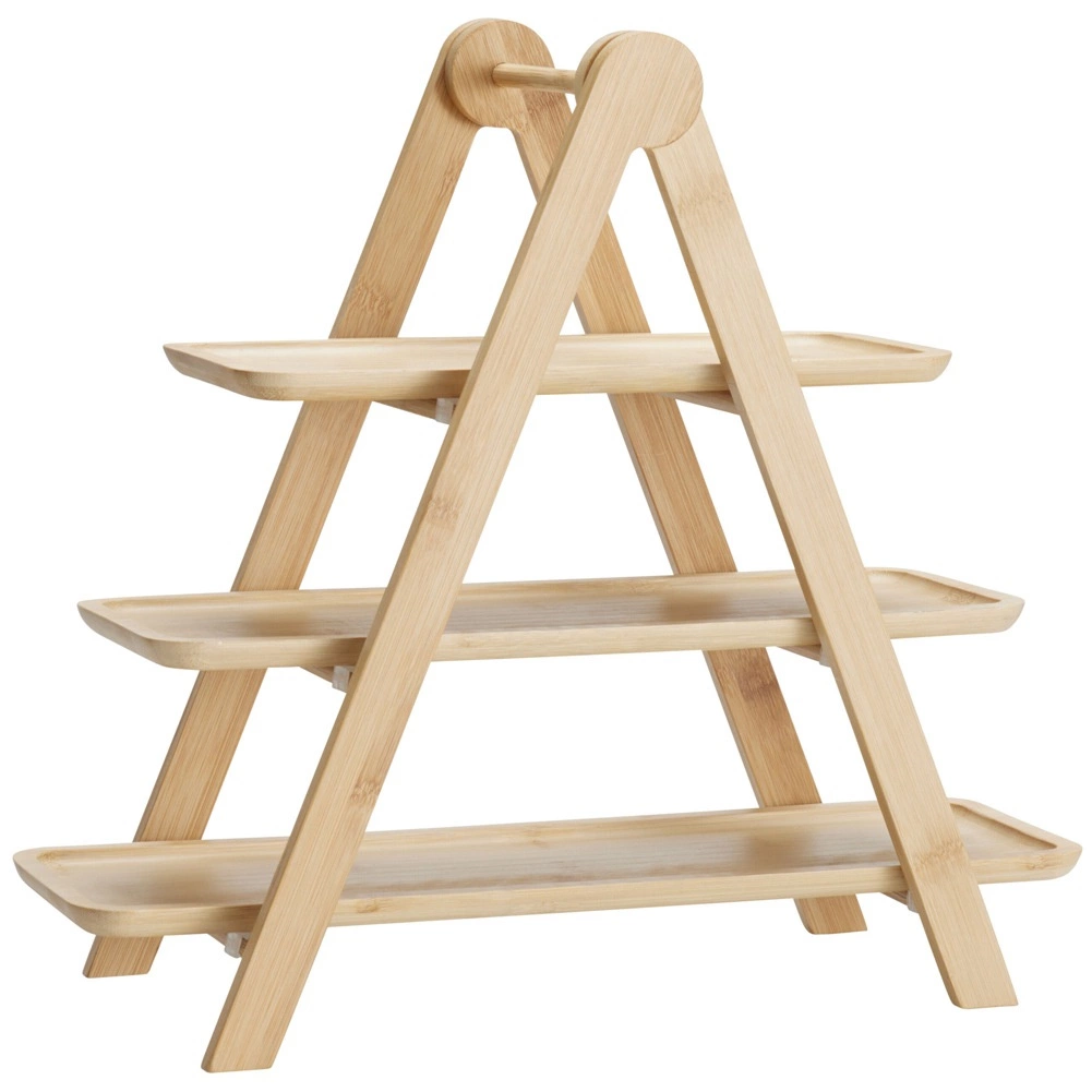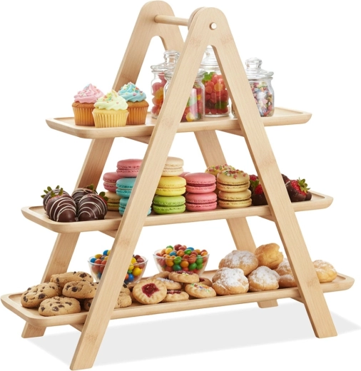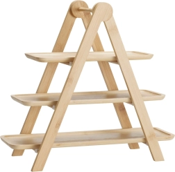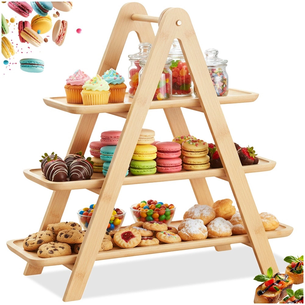 Táto štýlová trojúrovňová etažérka z prírodného bambusu sa stane stredobodom každého stolovania. Umožňuje prehľadne a efektne vystaviť sladké aj slané pochúťky a zároveň šetrí miesto vďaka vertikálnemu usporiadaniu. Vďaka prírodnému vzhľadu sa hodí do moderných aj rustikálnych interiérov.
