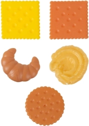 Taniere, príbory, nápoje, pečivo, vajíčka, koláčiky, kura aj omáčky – všetko na servírovanie, miešanie a stolovanie. Deti spoznávajú tvary a názvy potravín.