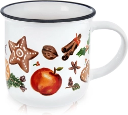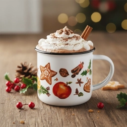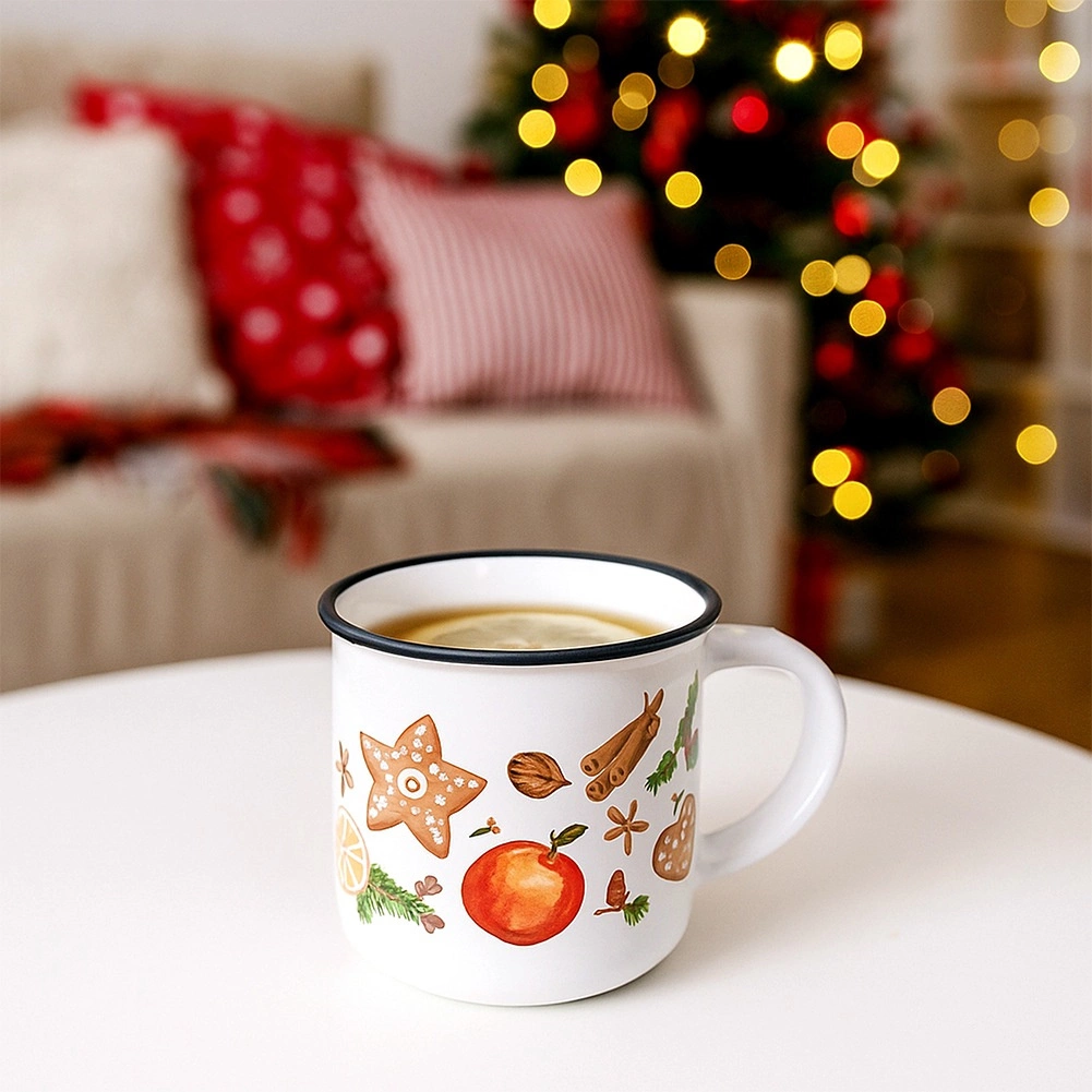 Vneste do svojho domova sviatočnú atmosféru s elegantným bielym hrnčekom zdobeným motívmi perníčkov, korenia, ovocia a zimných dekorácií. Čierny lem na hornom okraji podčiarkuje čistý dizajn a dodáva hrnčeku výnimočný charakter. Ideálny na horúce nápoje počas chladných dní.