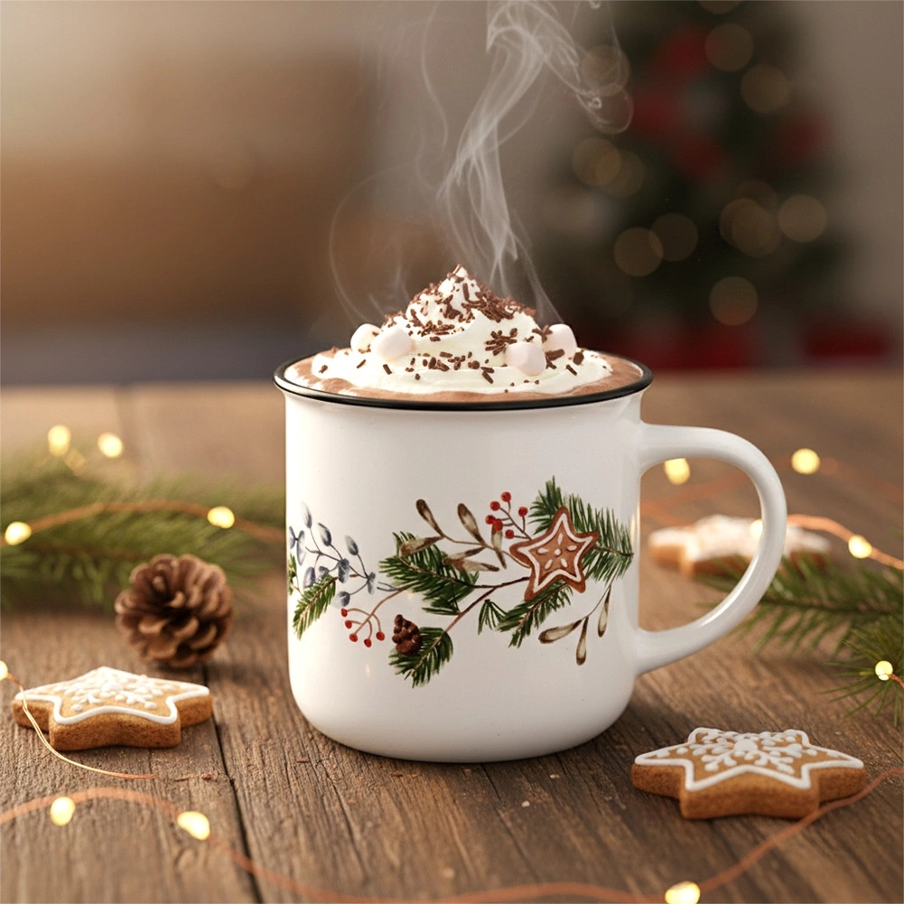 Užite si hrejivú atmosféru zimy s keramickým hrnčekom zdobeným vetvičkami ihličia, červenými bobuľami a perníčkovou hviezdičkou. Vďaka objemu 330 ml je ideálny na čaj, kávu, kakao aj varené víno. Jednoduchý, nadčasový tvar a čierny lem podčiarkujú elegantný vzhľad, ktorý sa hodí ku každej stolovej zostave.