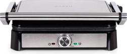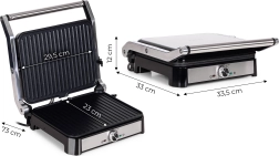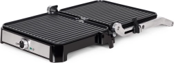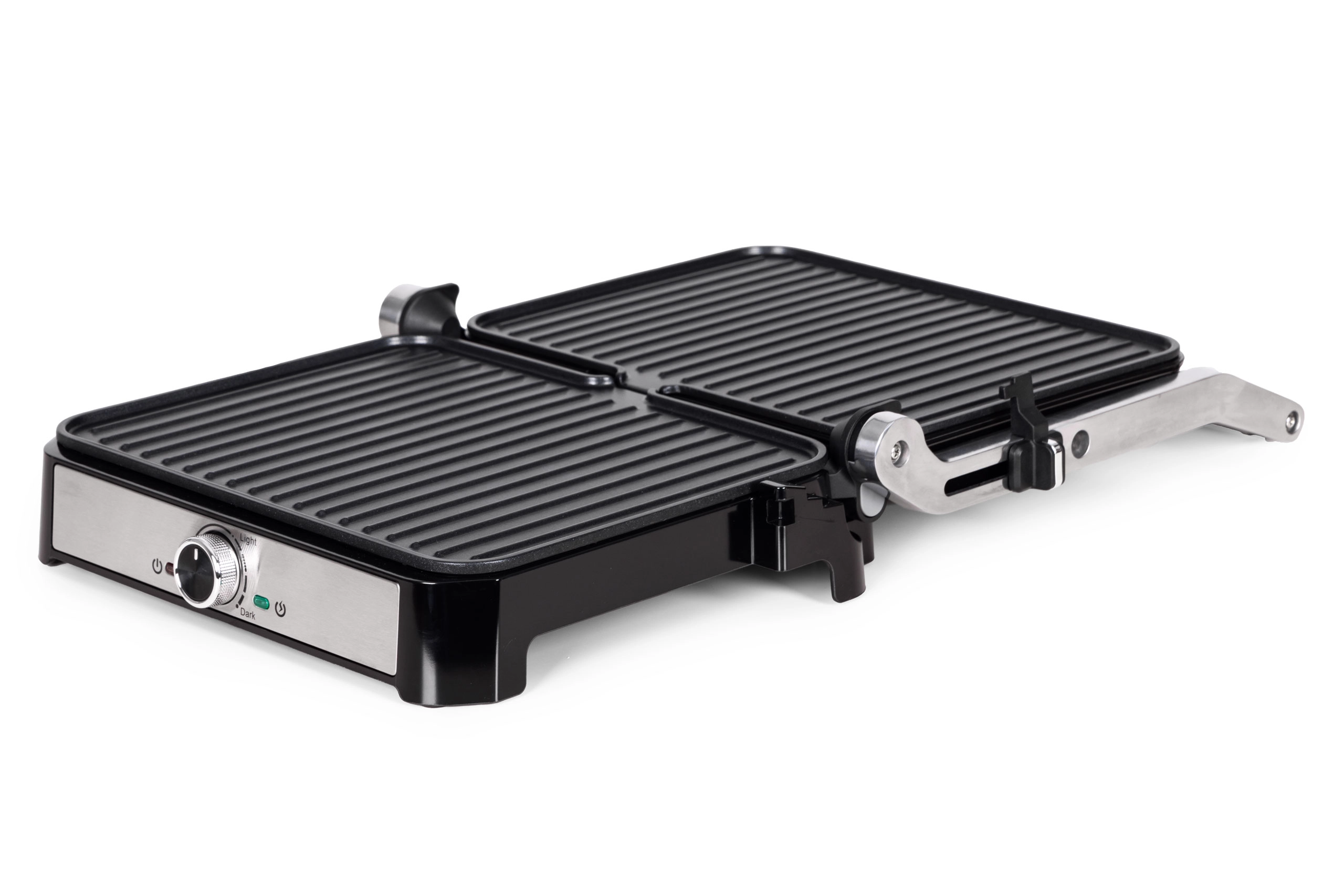 Otočný regulátor umožňuje presne nastaviť teplotu až na 220 °C, indikátory napájania a pripravenosti strážia správny okamih na vloženie surovín. Plne roztvárateľné veko na 180° premení gril na veľkú obojstrannú plochu 29,5 × 23 cm, takže ľahko obslúžite celú rodinu.