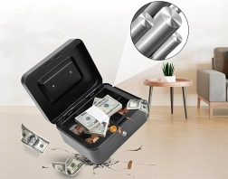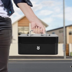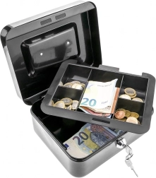 Vyberateľný plastový zásobník s priehradkami na mince zjednodušuje triedenie a inkaso, pod ním je miesto na bankovky a dokumenty. Odolné kovové telo s kvalitnými pántmi a pohodlné madlo zaručujú dlhú životnosť aj jednoduchý transport, či už na pokladni, na stánku alebo doma.
