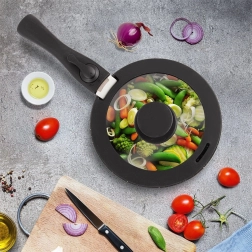 Vďaka pozdĺžnemu otvoru na odvod pary máte varenie pod kontrolou a možno ho využiť aj ako pomoc pri zlievaní tekutín. Špeciálny bočný výrez umožňuje bezproblémové použitie s riadom s odnímateľnou rukoväťou, a to ako na sporáku, tak v rúre do 220 °C.