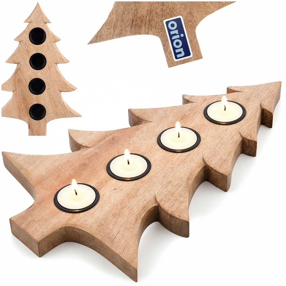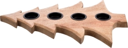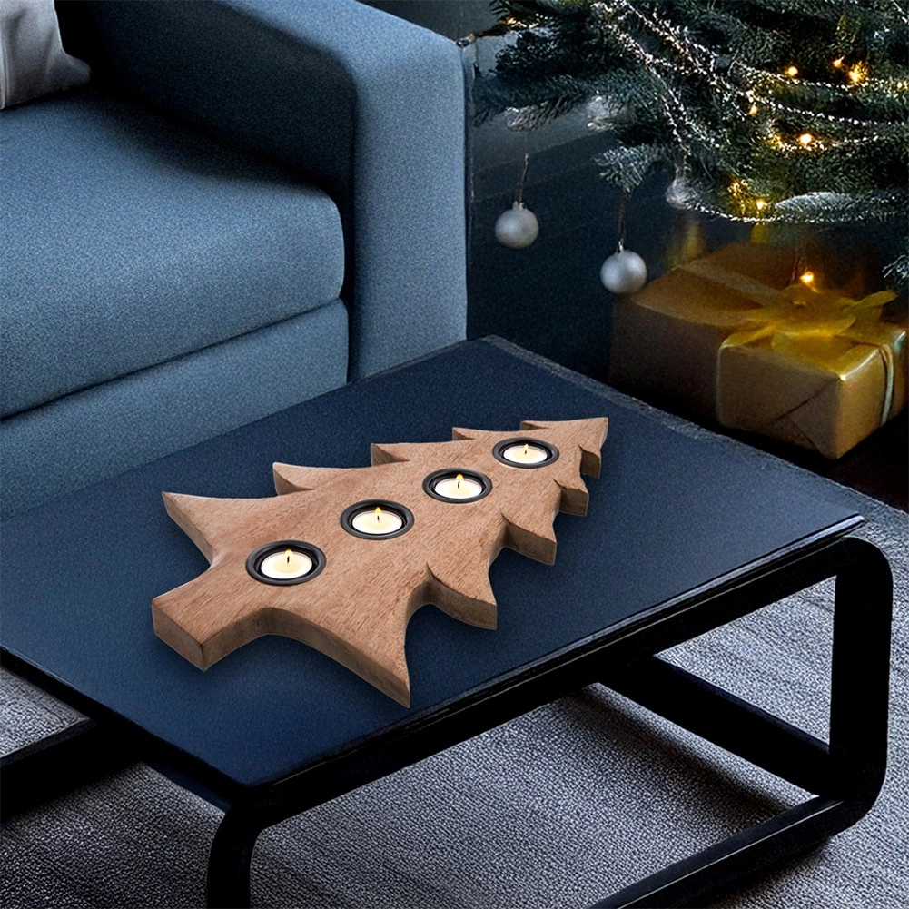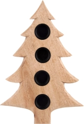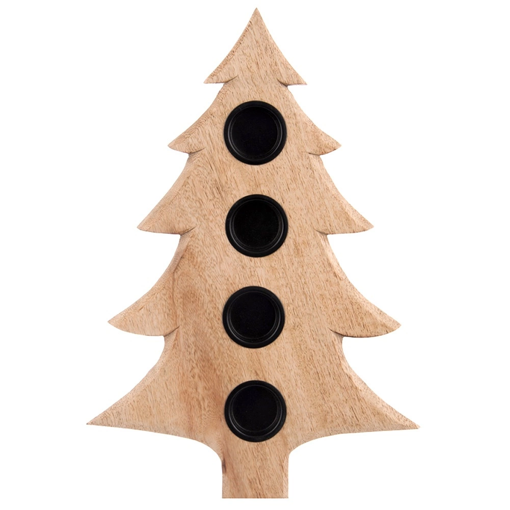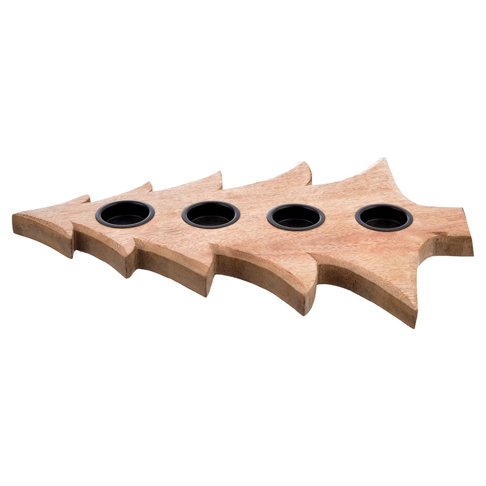Vytvorte si doma útulnú atmosféru s dreveným svietnikom v tvare vianočného stromčeka. Kombinácia mangového dreva a čiernych kovových misiek pre čajové sviečky dodáva dekorácii elegantný vzhľad a zároveň zaisťuje bezpečné používanie. Rozmery 40 × 27,5 × 2,5 cm umožňujú umiestniť svietnik na stôl, komodu aj okenný parapet.