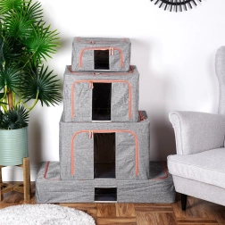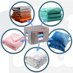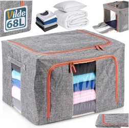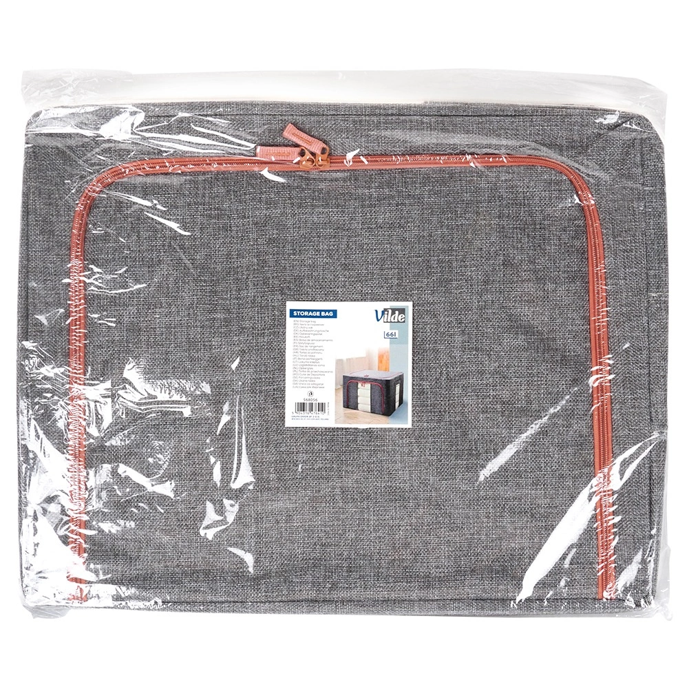 Udržujte domácnosť organizovanú s priestranným obalom s objemom 66 l a rozmermi 50 × 40 × 33 cm. Odolná polyesterová tkanina v sivom melíri s kontrastným zipsom spoľahlivo ochráni textílie pred prachom, vlhkosťou a škodcami. Vďaka pevnej vnútornej konštrukcii drží tvar a možno ho ľahko zasunúť do skrine alebo pod posteľ.