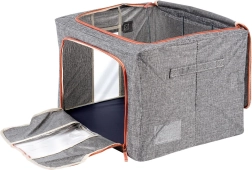 Praktické priehľadné panely umožnia okamžitý náhľad na obsah bez otvárania. Obal má zipsové otvory zhora aj spredu pre pohodlný prístup a dva robustné úchyty na jednoduché prenášanie. Keď sa práve nepoužíva, jednoducho ho zložíte naplocho a šetríte miesto.