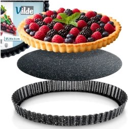 Táto okrúhla forma na tart s priemerom 28 cm a výškou 3 cm je ideálna na domácu prípravu tartov, quiche aj ďalších dezertov a slaných koláčov. Vyberateľné dno umožňuje komfortné a čisté vyklopenie hotového korpusu bez narušenia krehkých vlnitých okrajov.