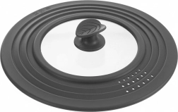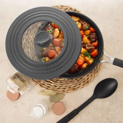 Táto univerzálna pokrievka z temperovaného skla a odolného silikónu v sivej farbe nahradí tri samostatné pokrievky. Vďaka stupňovitému silikónovému lemu perfektne sedí na riade s priemerom 24, 26 aj 28 cm a chráni hrany hrncov a panvíc pred poškodením. Priehľadné sklo umožňuje sleduť varenie bez dvíhania.