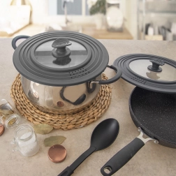 Stupňovitý silikónový okraj spoľahlivo sedí na troch najčastejších priemeroch, takže jedna pokrievka nahradí tri a šetrí miesto v kuchyni.