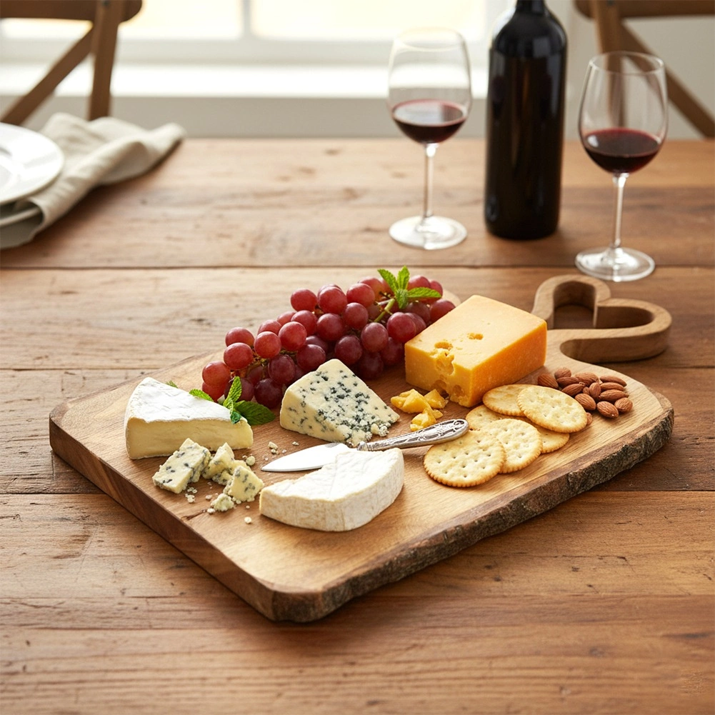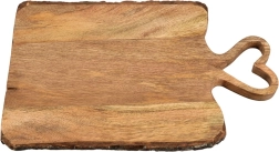 Štýlová drevená doska z mangového dreva s úchopom v tvare srdca je ideálna na krájanie aj servírovanie syrov, údenín a snackov. Rozmery 45 × 25 × 2 cm, pevná konštrukcia, odolná voči vlhkosti a pachom. Originálny produkt značky ORION.