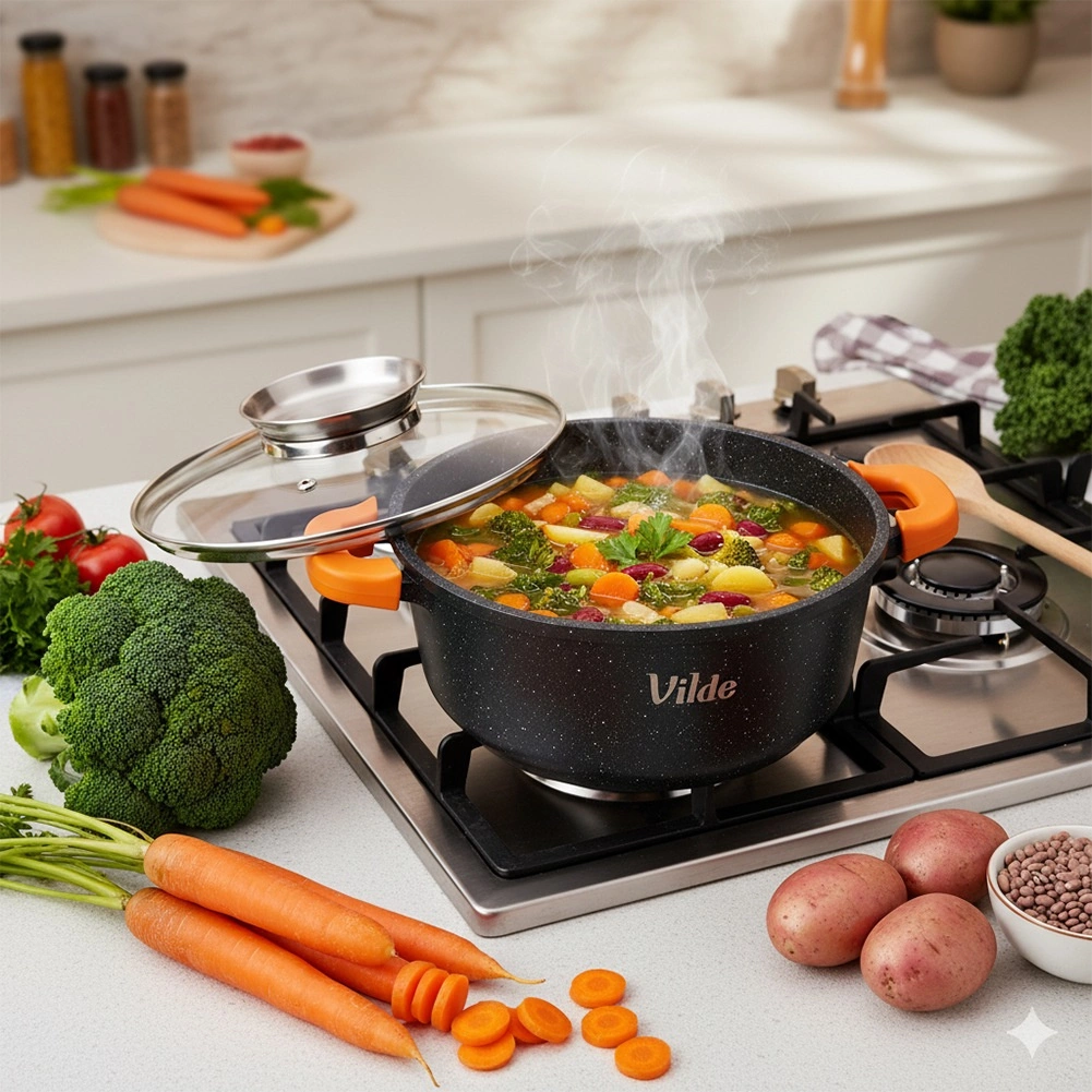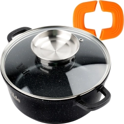 Uvarte polievky, dusené mäso aj aromatické guláše s menším množstvom oleja vďaka nepriľnavej granitovej vrstve. Sklenená pokrievka so širokým nerezovým úchytom funguje ako dávkovač – bez zdvíhania veka prilejete vodu, víno či vývar a zachováte ideálne podmienky na varenie.