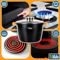 Univerzálne použitie: plyn, elektrina, sklokeramika, indukcia a pečenie v rúre do 200 °C (bez pokrievky). Originálny produkt značky VILDE z línie TERRUNA AROMA.