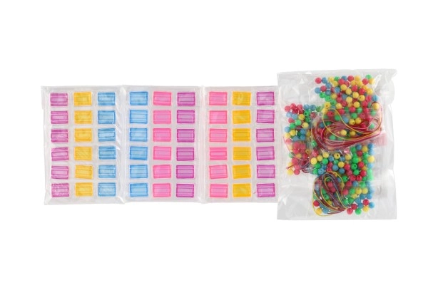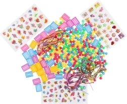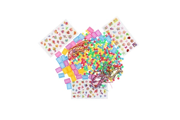 Súčasťou balenia sú štvorcové dieliky, plastové koráliky v rôznych tvaroch a farbách, pružné gumičky a penové samolepky na dotvorenie jedinečného štýlu. Skvelá voľba na domáce tvorenie, detské oslavy aj ako darček.